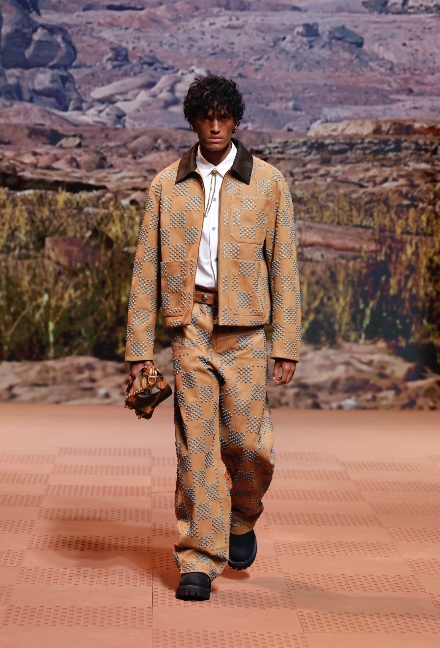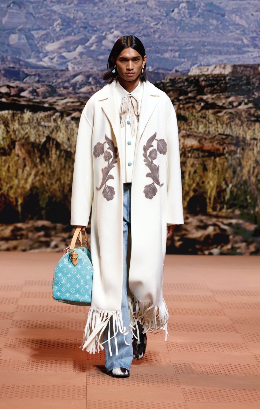 Louis Vuitton Sonbahar-Kış 2024 Erkek Defilesi, Kuzey Amerika’daki Kızılderili uluslarından şarkıcılardan oluşan bir Pow Wow grubu olan Native Voices of Resistance’ın performansına ev sahipliği yapıyor. Standing Rock Sioux Kabilesi’nden Dee Jay Two Bears tarafından tasarlanan ve Dakota ve Lakota uluslarından sanatçılar ve zanaatkarlarla iş birliği içinde yaratılan giysiler, işbirliğinin ve koleksiyonun yaratılış öyküsünü gliflerin görsel dili aracılığıyla anlatan günümüz “winter count” motifleriyle süsleniyor.