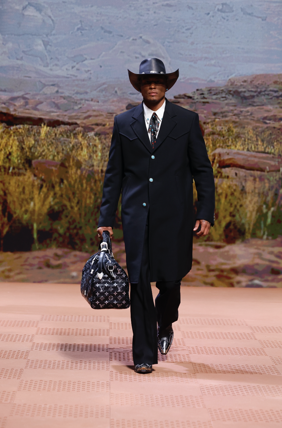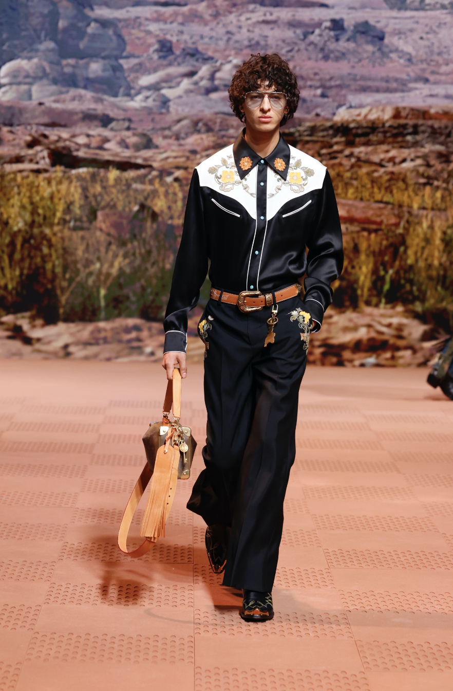 Louis Vuitton Dandy, Amerikan Batı giyim geleneği üzerinden gelişiyor. Kırsal bir mercekten yaklaşılan takım elbise ve gömlekler, Batı imgelerinin kaktüsleri, boğa boynuzu ve boloları ile zincirleniyor. “Workwear” siluetleri, el işlemeli metalik bakır çiçekleri olan vaquero ceketlerde, çok renkli güneş ışını boncuklu iş ceketlerinde ve metal çivili veya turkuaz süslemelerle oluşturulan ince çizgili veya Damier motifli takım elbiselerde usta terzilik eserlerine dönüşüyor. “Workwear”ın mücevheri olan tulumlar, ince kumaşlarla kutlanıyor. Western gömlekler bu türe özgü detay ve çiçek işlemelerini güçlendirirken, diğerler gömlekler kovboy Monogram jakarlı, kovboy dantelli, Western baskılı veya şamre kumaş üzerine Rus örgüsü işlemeli çelenk süslemeleri ile karşımıza çıkıyor.