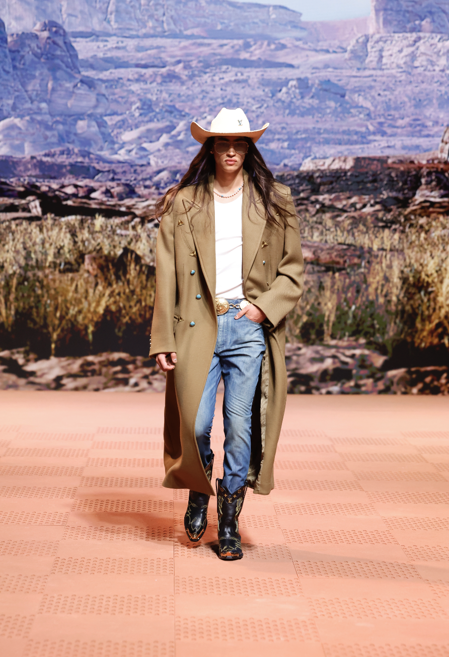 Louis Vuitton Sonbahar-Kış 2024 Erkek Koleksiyonu, Amerikan Batı gardırobunun köklerini aydınlatıyor. Maison’un temel içgüdüsü ve zihnin ebedi genişleticisi olan seyahat kavramı, Louis Vuitton’un bilgi birikimi aracılığıyla “workwear” in kökenlerinin keşfinde merkezde konumlanıyor. Değerli taşlardan el boyamasına ve uzman nakış tekniklerine kadar yüksek zanaatkarlığın hakim olduğu koleksiyon, Amerikan Batı giyim tarzının ikonografisine ışık tutuyor. Vizyon, Dakota ve Lakota uluslarından sanatçılarla ses, sahneleme ve koleksiyon unsurlarının yanı sıra Amerikalı bot üreticisi Timberland ile yaratıcı birlikteliği de içeriyor. Koleksiyon, sürekli olarak Maison erkek pratiğinin kalbinde yer alan LVERS topluluğunda kurulan bir arayışı sembolize ediyor.