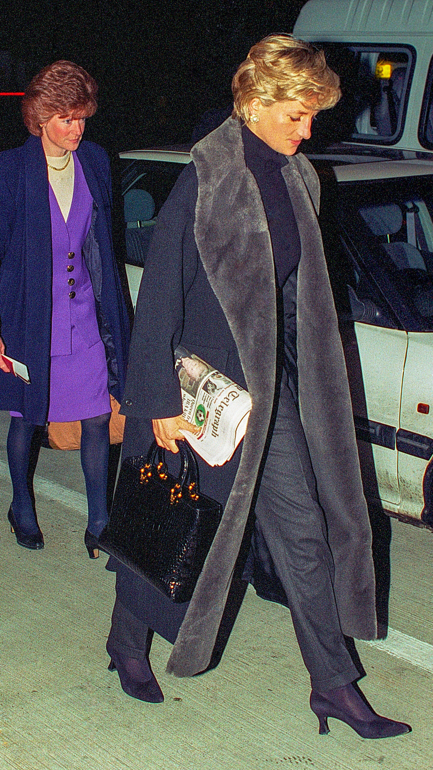 Koyu mavi peluş detaylı uzun palto, benzer tonlarda kumaş pantolon, kısa topuklu ayakkabı, deri bir çanta ve inci takılar aracılığıyla zamansız ve şık bir görünüm kazanan Diana Spencer, bu görünümünün üzerinden neredeyse 27 yıl geçmesine rağmen günümüz trendlerine halen yön vermeye devam eder nitelikte.