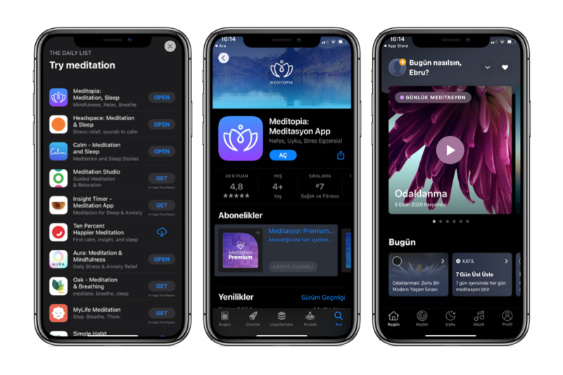 Türk geliştiriciler tarafından geliştirilen ve 60’dan fazla ülkede üyesi bulunan başarılı uygulama Meditopia ile farkındalık yolculuğuna çıkabilir, rahatlamayı öğrenebilirsiniz. iPhone’unuz yanınızda değilken bile tüm içeriklere Apple Watch üzerinden de erişebilir, kolay kullanım için Siri kısayolları oluşturabilirsiniz. Apple Watch’unuz günlük rutinlerinizi öğrenerek doğru zamanda doğru meditasyonu size önerir.