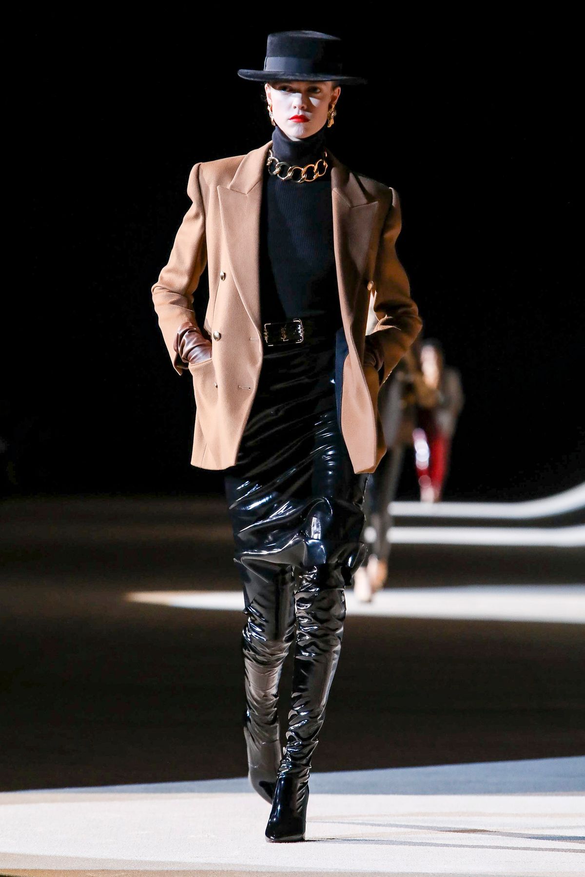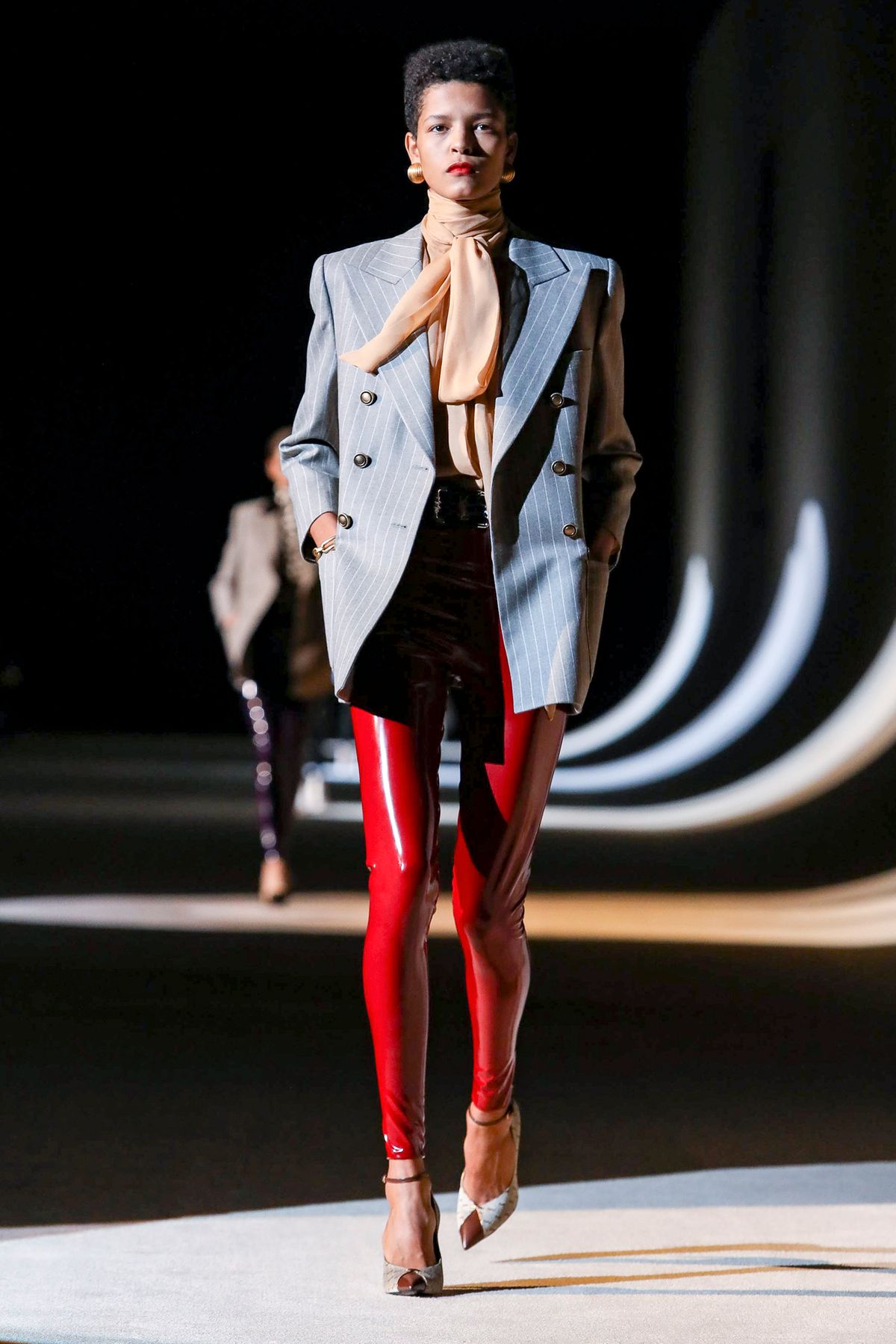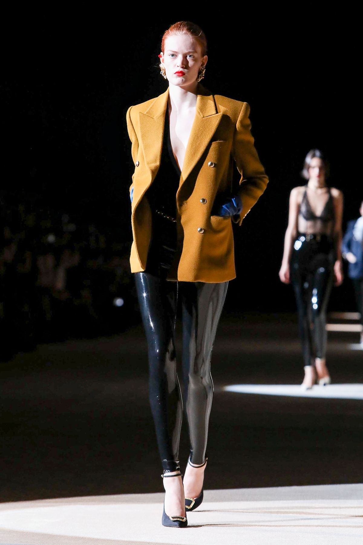 Lateks, Sonbahar / Kış 2020 koleksiyonunun can damarı kesinlikle. Şaşırtıcı canlı renklere sahip olmaları, görünümleri daha da ilgi çekici hale getiriyor. 90’lar esintisi taşıyan bu kolekisyon, Saint Laurent’in gece hayatı görünümünü kanalize etmek için oluşturduğu sağlam parçalarla dolu. Lateks dışında, kalem etekler ve blazerlar radarımıza takılan kusursuz görünümlerden.