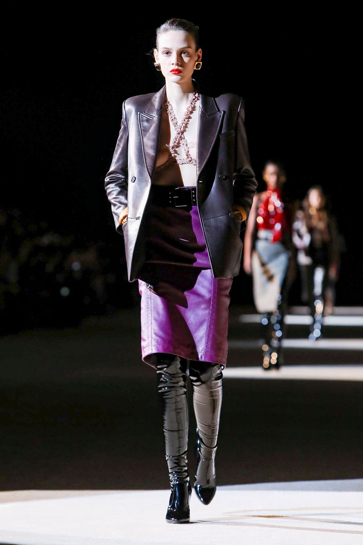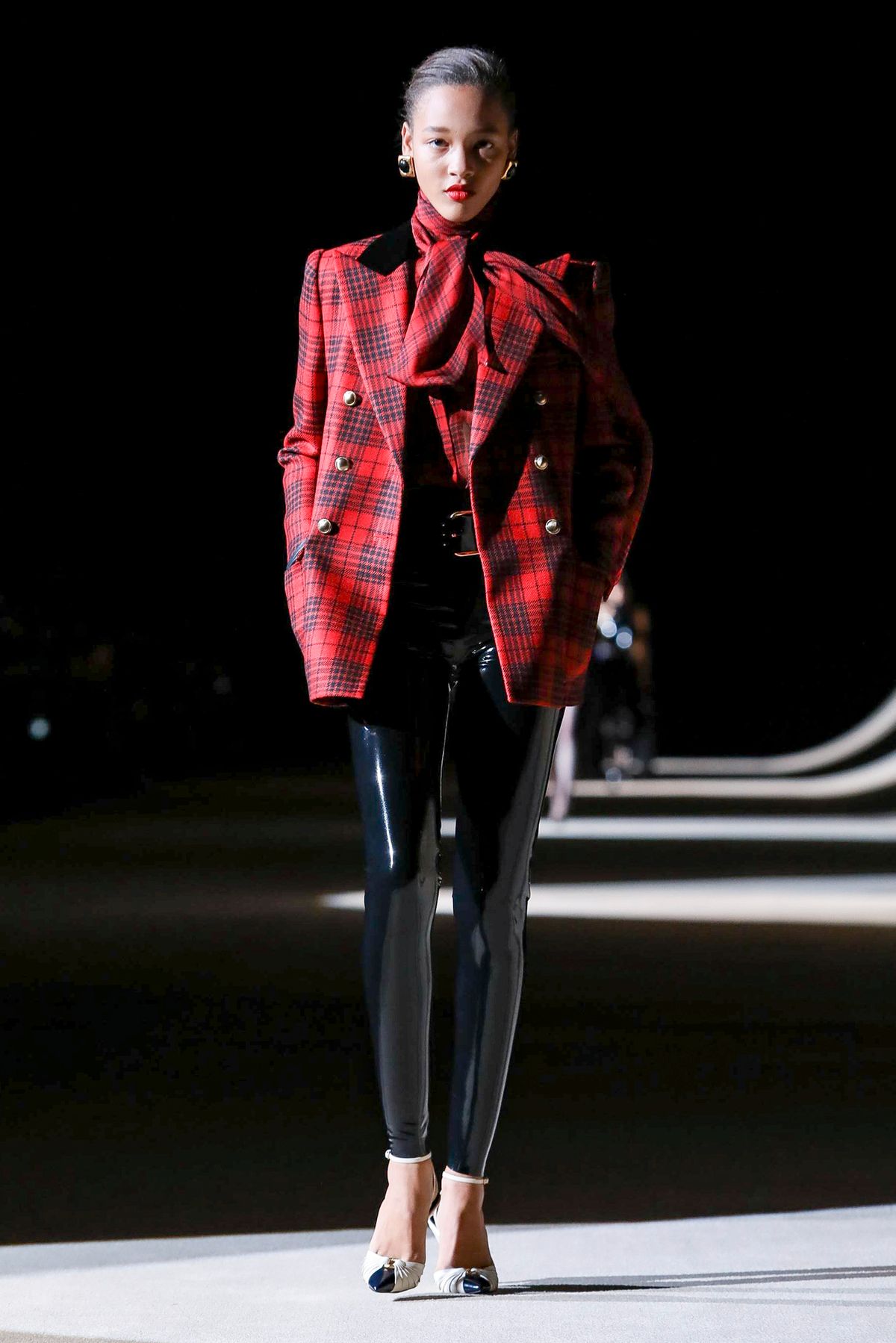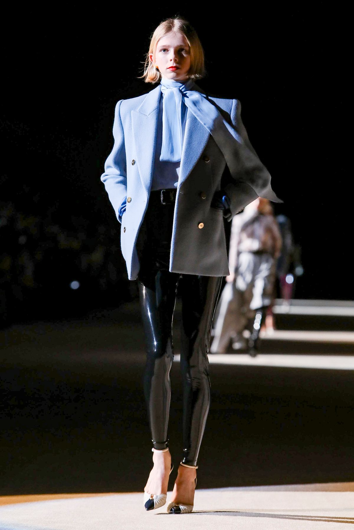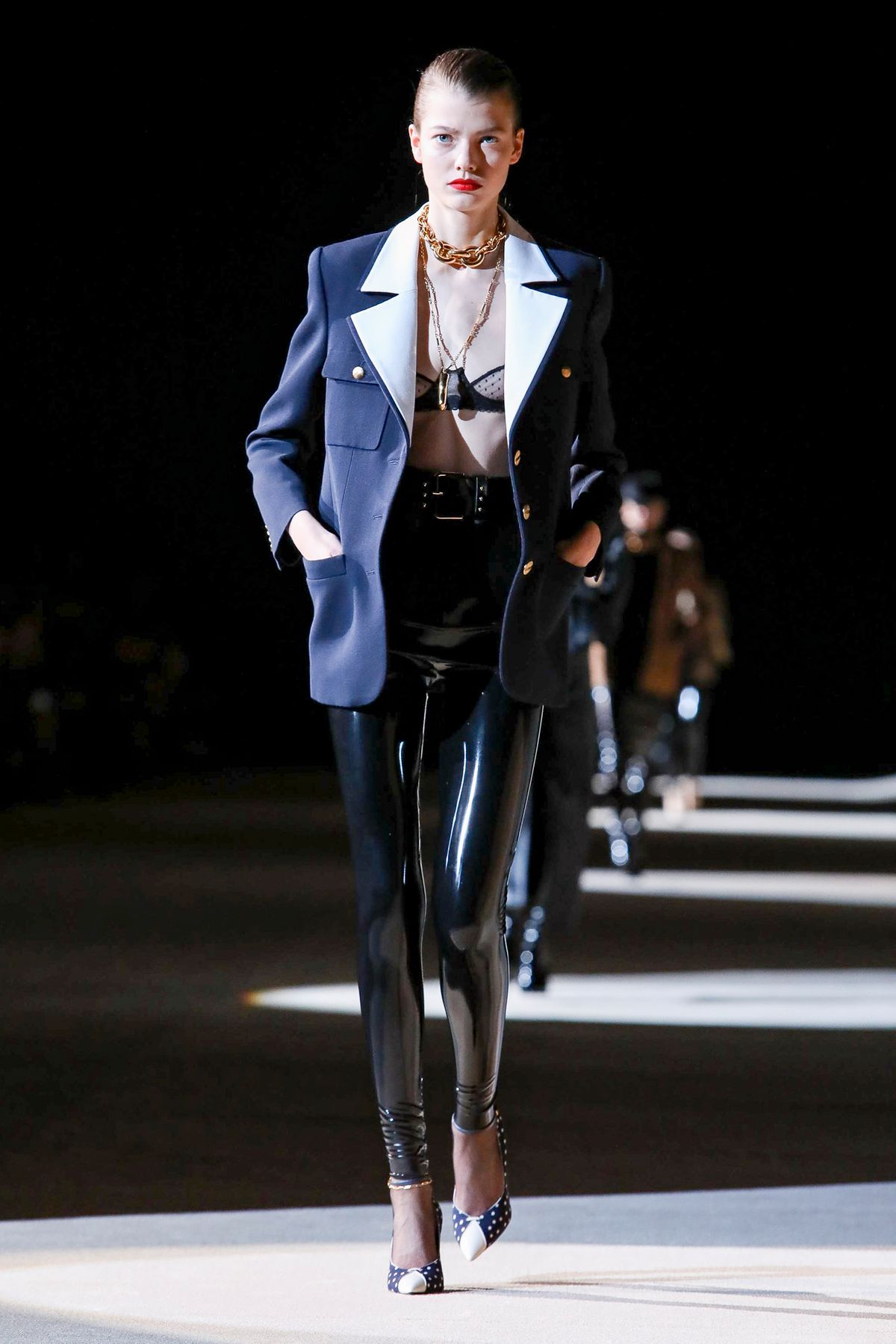 Lateks, Sonbahar / Kış 2020 koleksiyonunun can damarı kesinlikle. Şaşırtıcı canlı renklere sahip olmaları, görünümleri daha da ilgi çekici hale getiriyor. 90’lar esintisi taşıyan bu kolekisyon, Saint Laurent’in gece hayatı görünümünü kanalize etmek için oluşturduğu sağlam parçalarla dolu. Lateks dışında, kalem etekler ve blazerlar radarımıza takılan kusursuz görünümlerden.