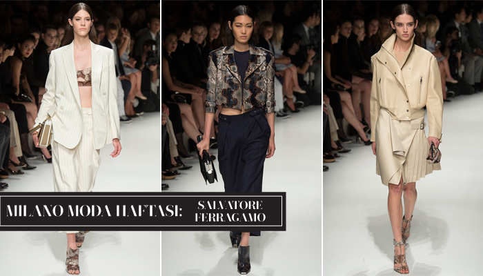 Christopher Kane’in 2013 – 2014 Sonbahar – Kış defilesinde yer verdiği plili etekler, Salvatore Ferragamo’nun da dikkatinden kaçmıyor. 2014 İlkbahar – Yaz sezonu için nude renklerden destek alan kreatif direktör Massimiliano Giornetti; şehir ve safariyi yeniden bir araya getiriyor. Bu sezon maskulen trend’in öncüsü olan takım elbiseler, markayla birlikte daha feminen bir hale bürünüp yılan derisi büstiyerlerle tamamlanıyor.