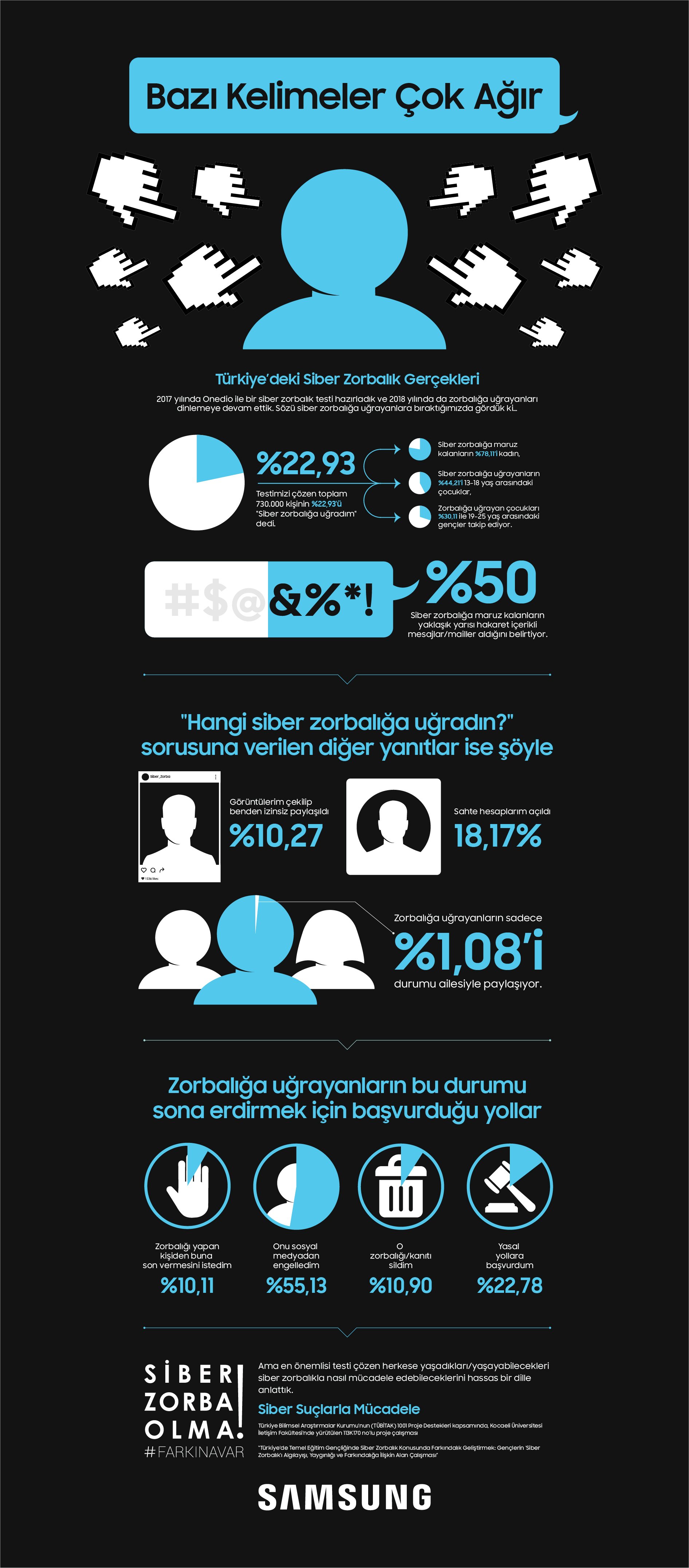 Samsung Electronics Türkiye Ba?kan? DaeHyun Kim, “Samsung Electronics Türkiye olarak, Bilgi Teknolojileri ve ?leti?im Kurumu (BTK) i?birli?i ile çocuklar?m?z ve gençlerimiz üzerinde ciddi psikolojik ve fiziksel zararlara neden olabilen siber zorbal???n ne oldu?u ve yol açabilece?i zararlar konusunda “Siber Zorba Olma!” hareketini ba?latmam?z?n üzerinden 1 y?l geçti. Y?l içinde verilen fark?ndal?k e?itimlerinin yan? s?ra, geçti?imiz y?l oldu?u gibi 13 Aral?k günü kamuoyunun dikkatini siber zorbal??a çekmek için sosyal medya hesaplar?m?z? karartarak “Baz? Kelimeler Çok A??r” slogan?n? “Siber Zorba Olma! #farkinavar” hashtag’i ile payla?acag?z. Tüm sosyal medya kullan?c?lar?n? da bu fark?ndal?k hareketinin bir parças? olmaya davet ediyoruz.