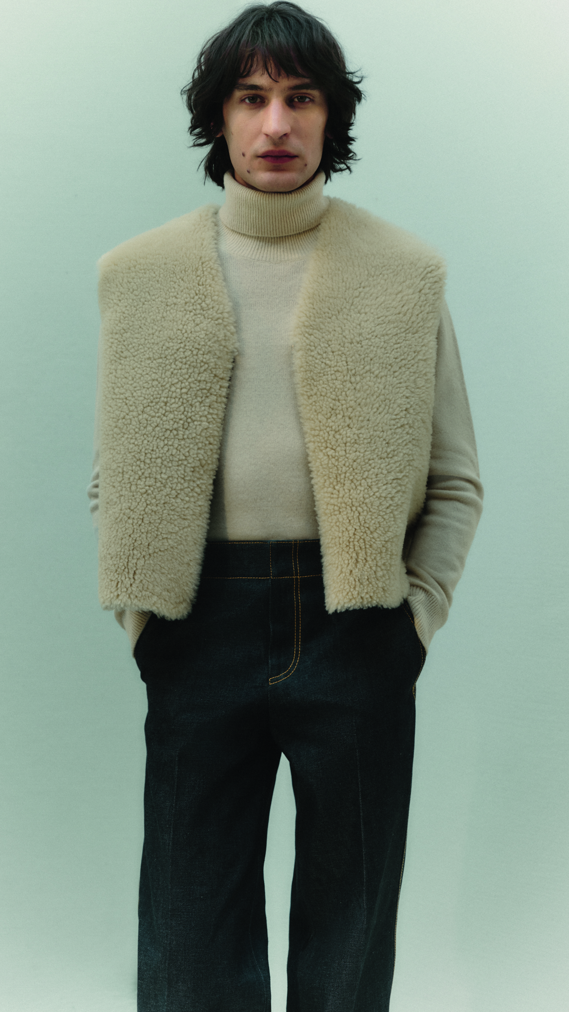 SANDRO 2024 Sonbahar/Kış Koleksiyonu, erkek giyim için ise dokuları ustaca harmanlayarak lüksü ve sofistike şıklığı bir araya getiriyor. Yüksek kaliteli materyallerle işlenmiş zarif bir yelek, konyak rengi deriden özenle tasarlanmış bir kaban, bol paça pantolonlar ve geniş kesim termal birleşimli denimler, modern bir dokunuşla etkileyici bir görünüm sunuyor.