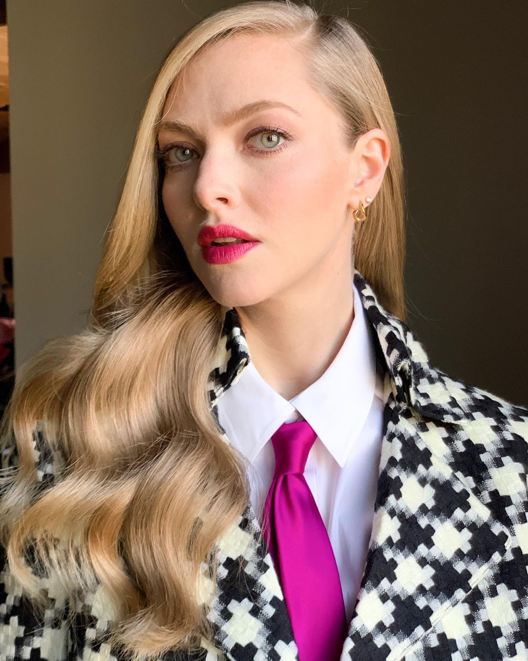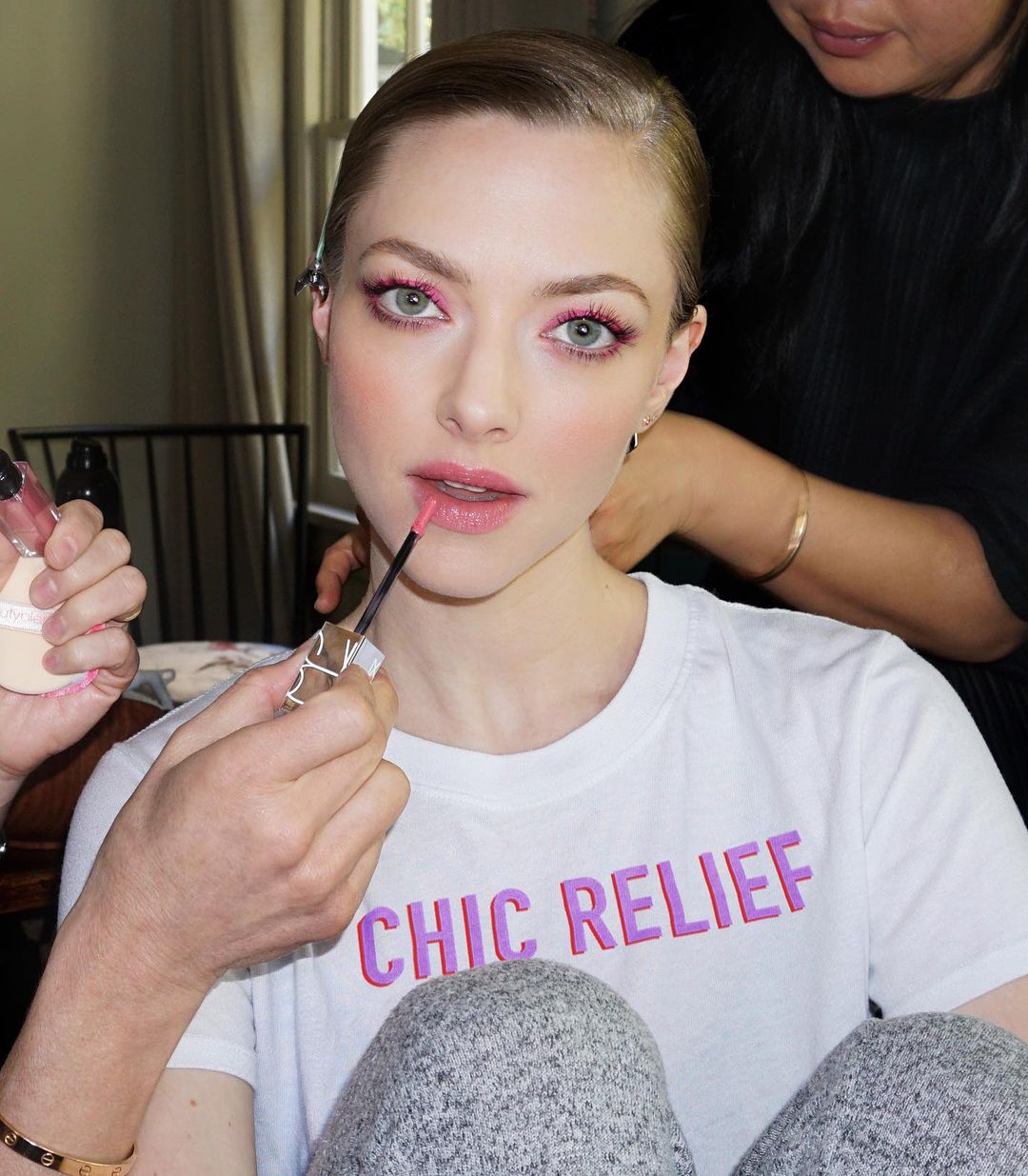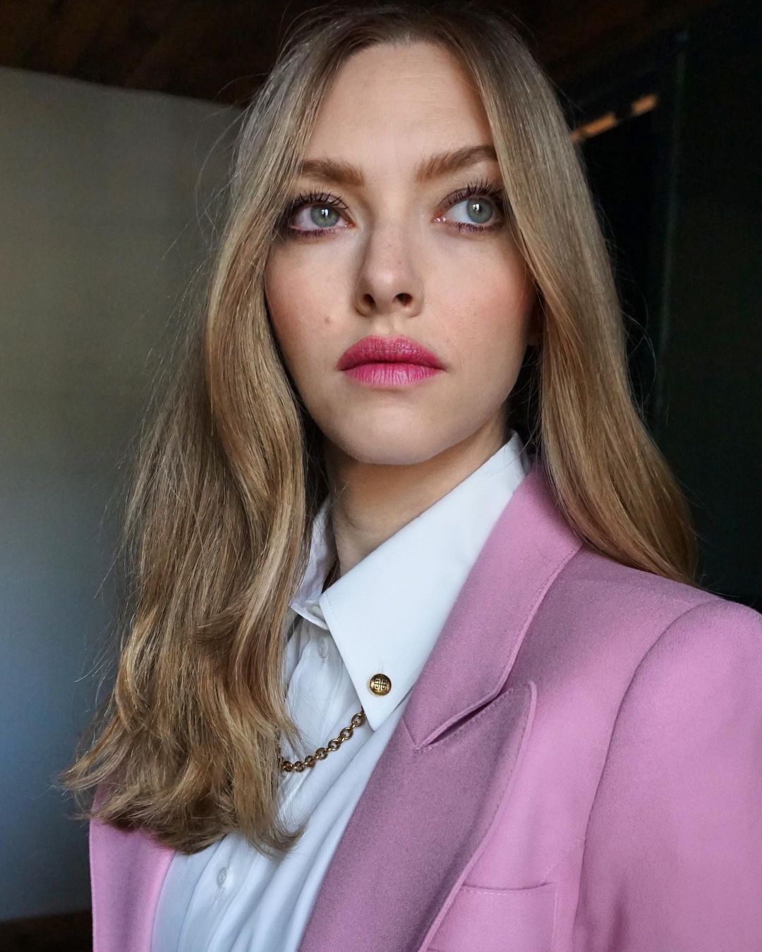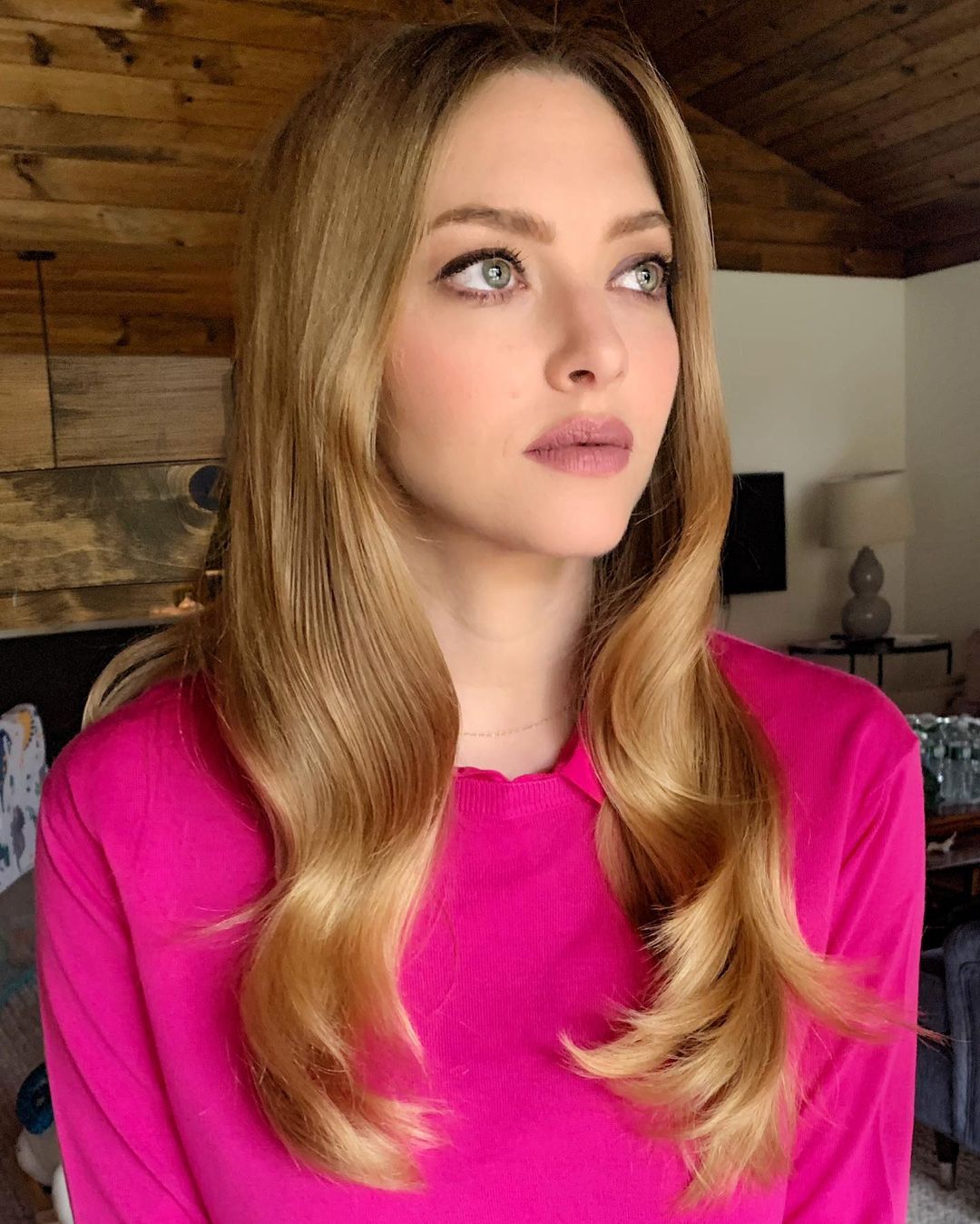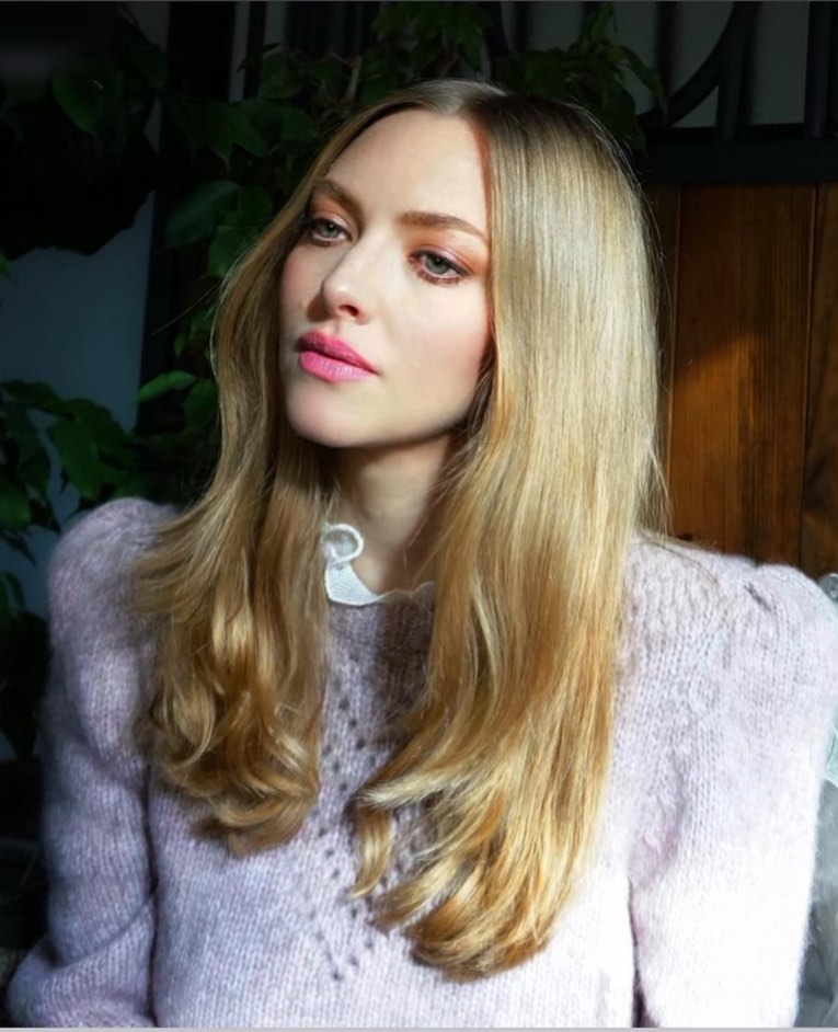Beyaz ten, sarı saçlar ve renkli göz olunca Amanda Seyfried için de favori ruj rengi pembe oluyor. Seyfried, pembenin her tonuna ruj seçimlerinde yer veriyor. Fuşya rengi bu koyu pembe tonu makyajda yanaklarda hafif şeftali tonunda bir allık kullanılıyor. Gözlerde ise kahverenginin en açık tonuyla bir renk eşitliği sağlanıyor. Kirpiklere hafif bir maskara uygulaması ve kirpikleri daha sık göstermesi için ince çekilmiş bir siyah eyeliner ile makyaja son dokunuş yapılıyor.