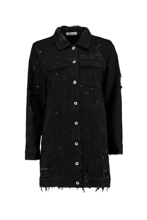 Uzun ve yırtık bu jean ceket ile top model havası elde edin. Boohooo