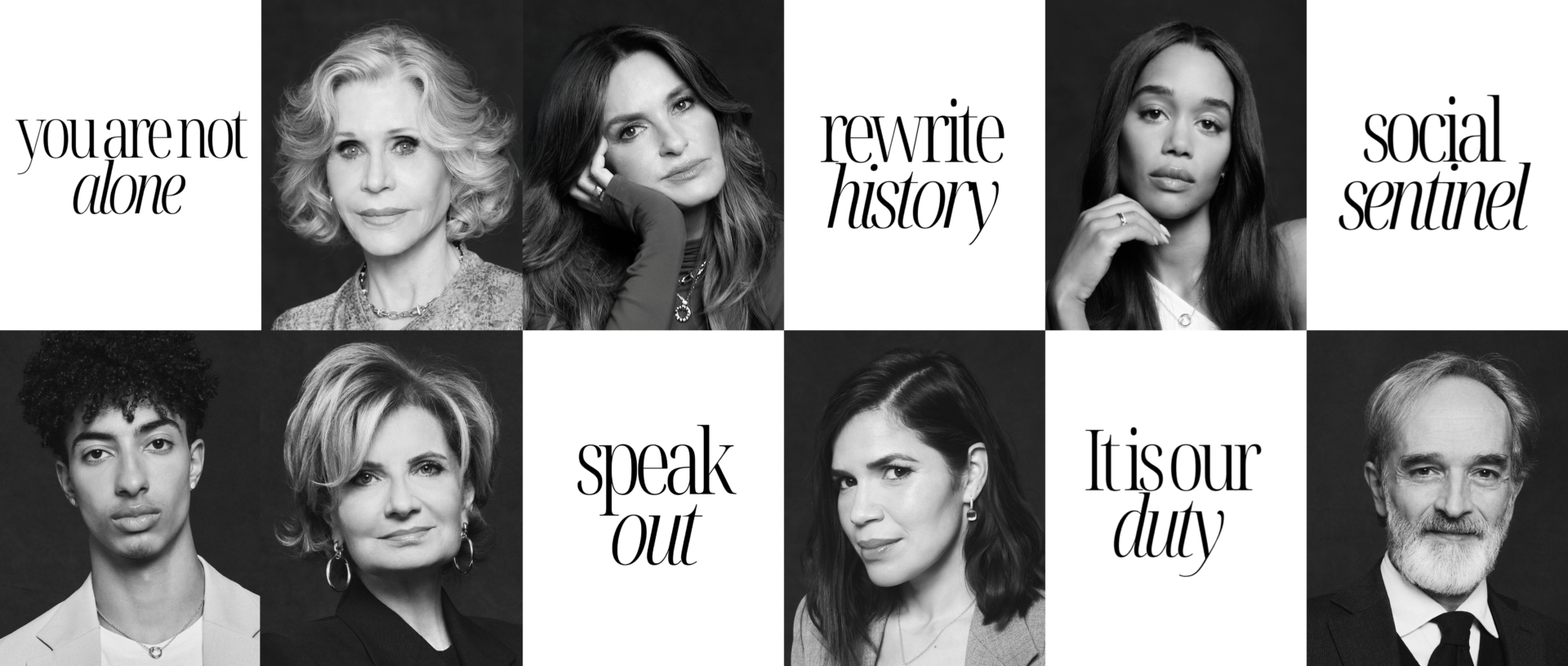 Bu girişimde, Oscar ödüllü oyuncu ve aktivist Jane Fonda, ödüllü oyuncu, yönetmen, yapımcı ve aktivist America Ferrera, The Joyful Heart Foundation adlı sivil toplum kuruluşunun kurucusu ve oyuncu Mariska Hargitay, oyuncu Laura Harrier, Olimpiyat sporcusu Mattia Furlani ve Vita Salute San Raffaele Üniversitesi deneysel biyoloji profesörü Gianvito Martino yer alıyor. Ek olarak, Pomellato CEO’su ve #PomellatoForWomen platformunun kurucusu Sabina Belli ile birlikte bu toplumsal krize karşı toplumun sessizliği sorgulanıyor.