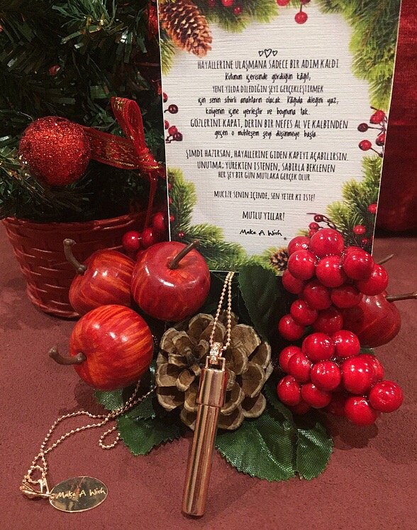 Özel olarak tasarlanan kutusu ve zarif görünümüyle benzersiz bir yeni yıl hediyesi haline gelen Dilek Kolyeleri, 2018 yılını sevdikleriniz için unutulmaz kılacak! Bu özel günde hediye edeceğiniz kolyeyi seçmek için, Make a Wish Design’ın Instagram sayfasına uğramanız yeterli!