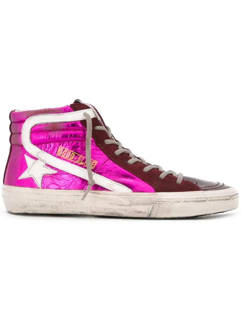Golden Goose Deluxe Brand Slide Hi-Top Sneakers Pembe tercihinizi daha metalik tonlardan yana kullanmak isterseniz, Golden Goose sneakerlara bakabilirsiniz.