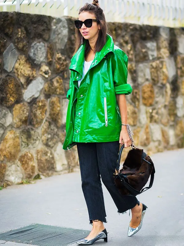 Siyah jean pantolonu neden bir türlü kombinleme imkanı bulamadığınız ilginç parçalar için kullanmayasınız ki? Natasha Goldenberg’in çay yeşili ceketi, kürk çantası ve gümüş ayakkabıları bunun en iyi örneği.