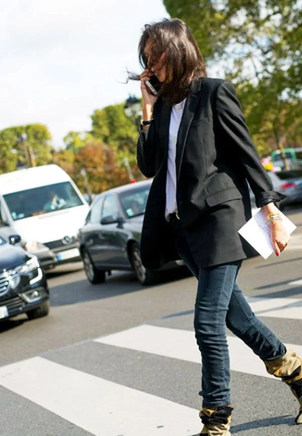 İşte sonsuza dek yaşayacak olan bir klasik kombo. Siyah blazer ceket, siyah denim pantolon, beyaz tişört ve boho botlar. Parizyen stilin değişmez silahlarından.