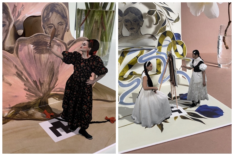 Bu dijital deneyim, sınırlı sayıda üretilmiş, Simone Rocha x H&M kampanyasında da yer alan İngiliz ressam Faye Wei Wei’yle ortak çalışma sonucu yaratılan çok güzel bir kitap vasıtasıyla gerçekleştirildi. (Rocha’nın sanatçılar ve imaj yaratıcılarıyla basılı malzeme yaratma geçmişine bir selam niteliğinde). Wei Wei’ nin beş farklı karmaşık resmi kitapta yer alıyor ve Simone Rocha x H&M koleksiyonunu AR’da modelleyebilmek için QR kodlarıyla sayfada hayat bulan bir grup yetenekli insanın karakterlerinden oluşan pop-up fonlar olarak hizmet ediyorlar.