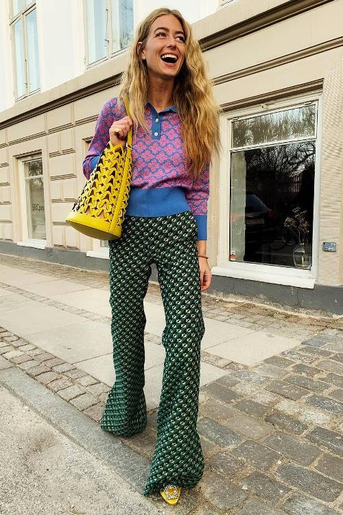 Emili Sindlev, kesinlikle desenlerin nas?l kullan?laca??n? biliyor! Geni? paça pantolonu ve örgü kaza?an?n y?ld?zla?t??? retro etkile?imli görünümüne bay?ld?k!