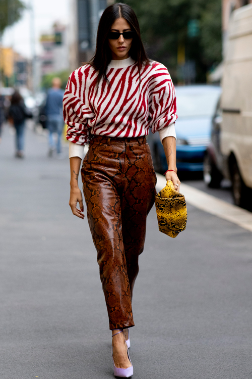 Deri pantolon arayışında olanlara kuralları yıkmaya hazırlanan iki alternatif öneri. Hayvan desenli yüksek bel deri pantolonunuzu hayvan deseni taşıyan kazak ve çantalarınızla birleştirebilirsiniz. Bu uyumun sokaktaki cezbediciliğine kapılmamak ne mümkün.