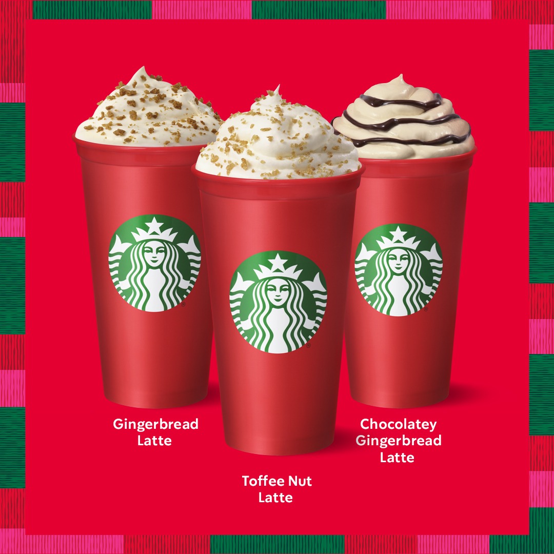 Kahve markası Starbucks’ın yılbaşına özel içecek serisindeki Toffee Nut Latte; espresso, Toffee Nut şurubu, süt ve kremanın birleşiminden oluşuyor. Yeni yılın simgelerinden Gingerbread Latte ise zencefilli kurabiye şurubu, espresso, süt ve krema ile hazırlanıyor. Chocolatey Gingerbread Latte ise; mocha sosu, espresso, süt, zencefilli kurabiye şurubu ve krema ile hazırlanıyor.