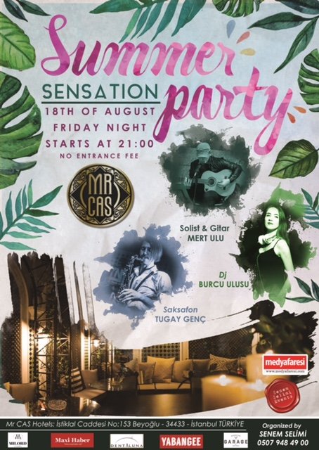 Organizasyonu Parti Gurusu Senem Selimi tarafından yapılan 18 Ağustos Cuma akşamı 21:00’de Mr Cas Hotels Beyoğlu’nda gerçekleşecek olan ‘’Summer Sensation” temalı parti eğlenceseverleri bekliyor.