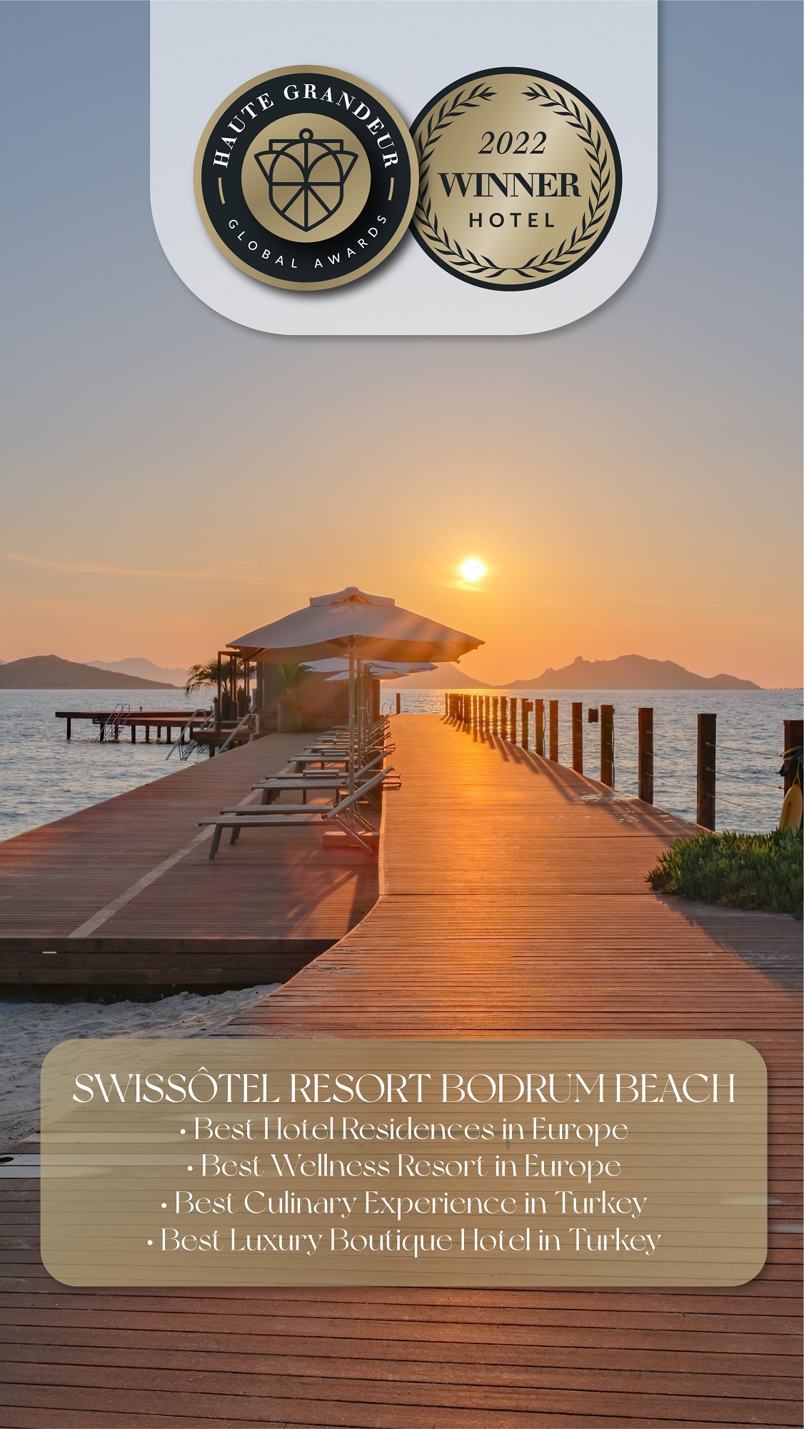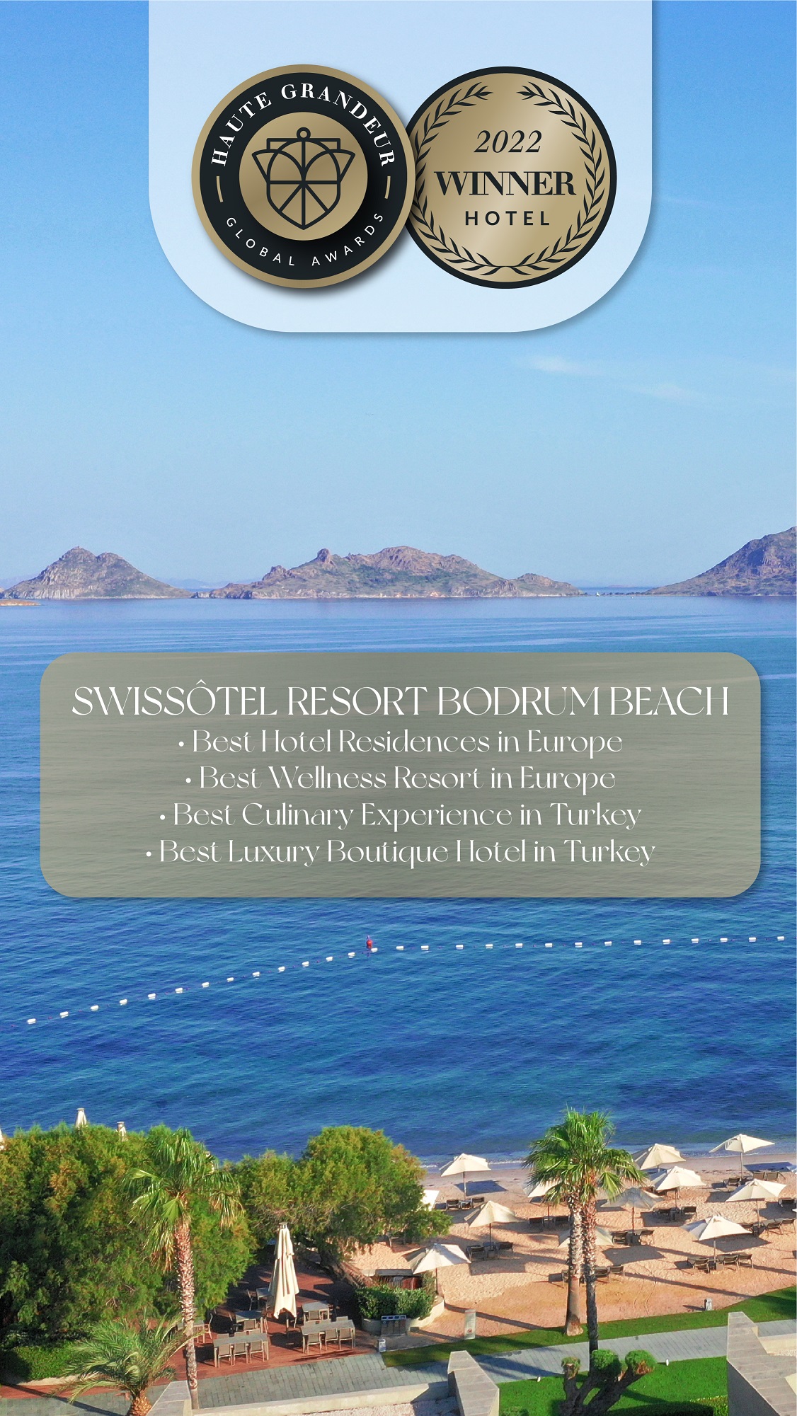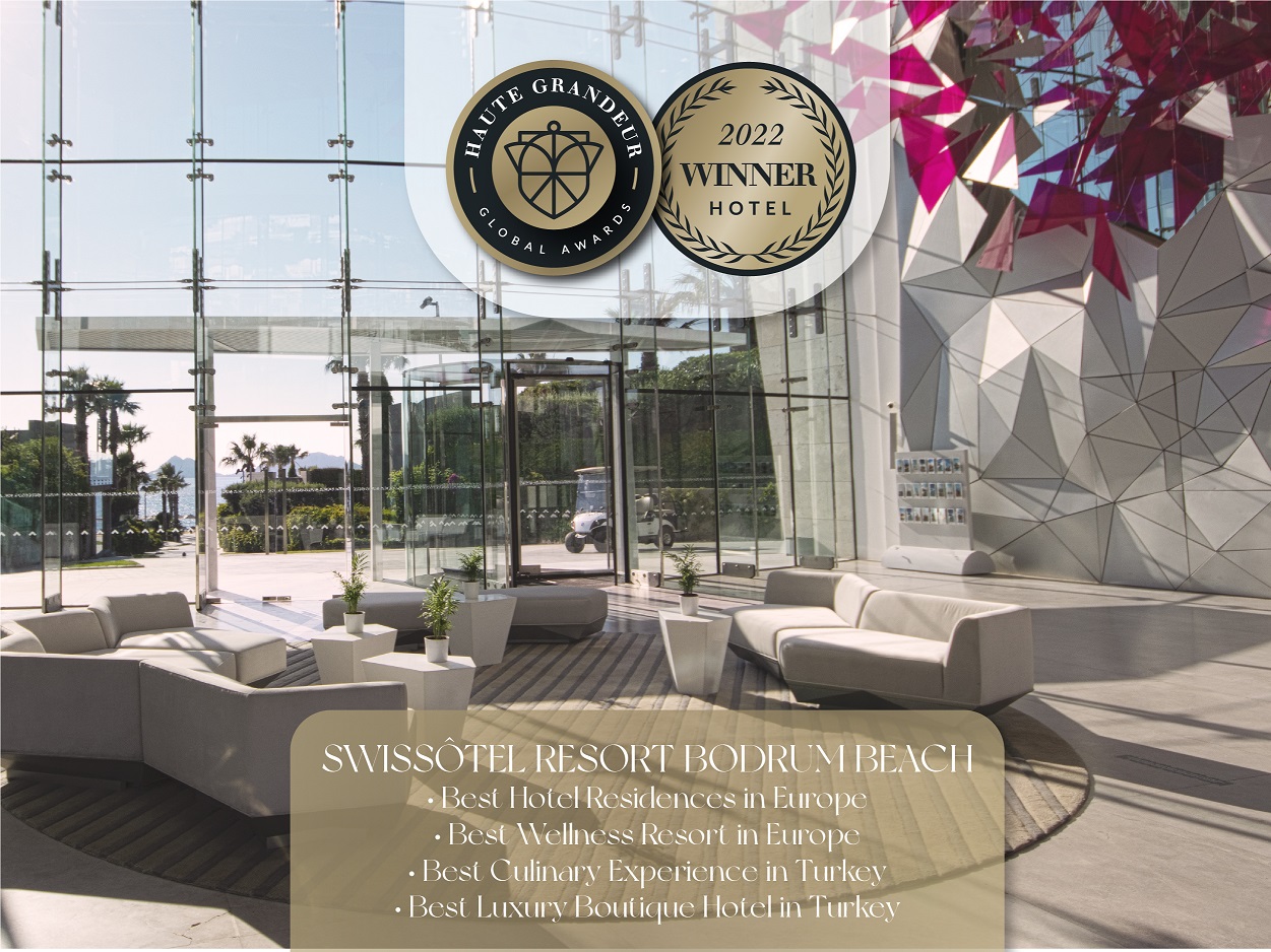 Bodrum turizminin simge markası Swissôtel Resort Bodrum Beach, 7 kıtadan 172 ülkeden otellerin 90, spa’ların ise 32 ayrı kategoride değerlendirildiği 2022 Haute Grandeur Hotel Awards’ta; Best Hotel Residences in Europe, Best Welness Resort in Europe, Best Culinary Experience in Turkey ve Best Luxury Boutique Hotel in Turkey ödüllerinin sahibi oldu.
