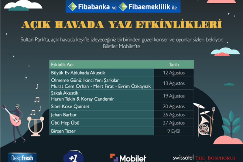 12 Ağustos’ta Büyük Ev Ablukada Akustik konseri ile başlayacak olan Açık Havada Yaz Etkinlikleri, Mert Fırat ve Evrim Özkaynak’ın sesleriyle hayat bulan ‘’Ölmeme Günü: İkinci Yeni Şarkılar’’, Şakalı Akustik Harun Tekin & Koray Candemir, Sibel Köse Quintet, Jehan Barbur, Übü Hep Übü, Birsen Tezer performansları ile Swissôtel The Bosphorus, İstanbul’da devam edecek.