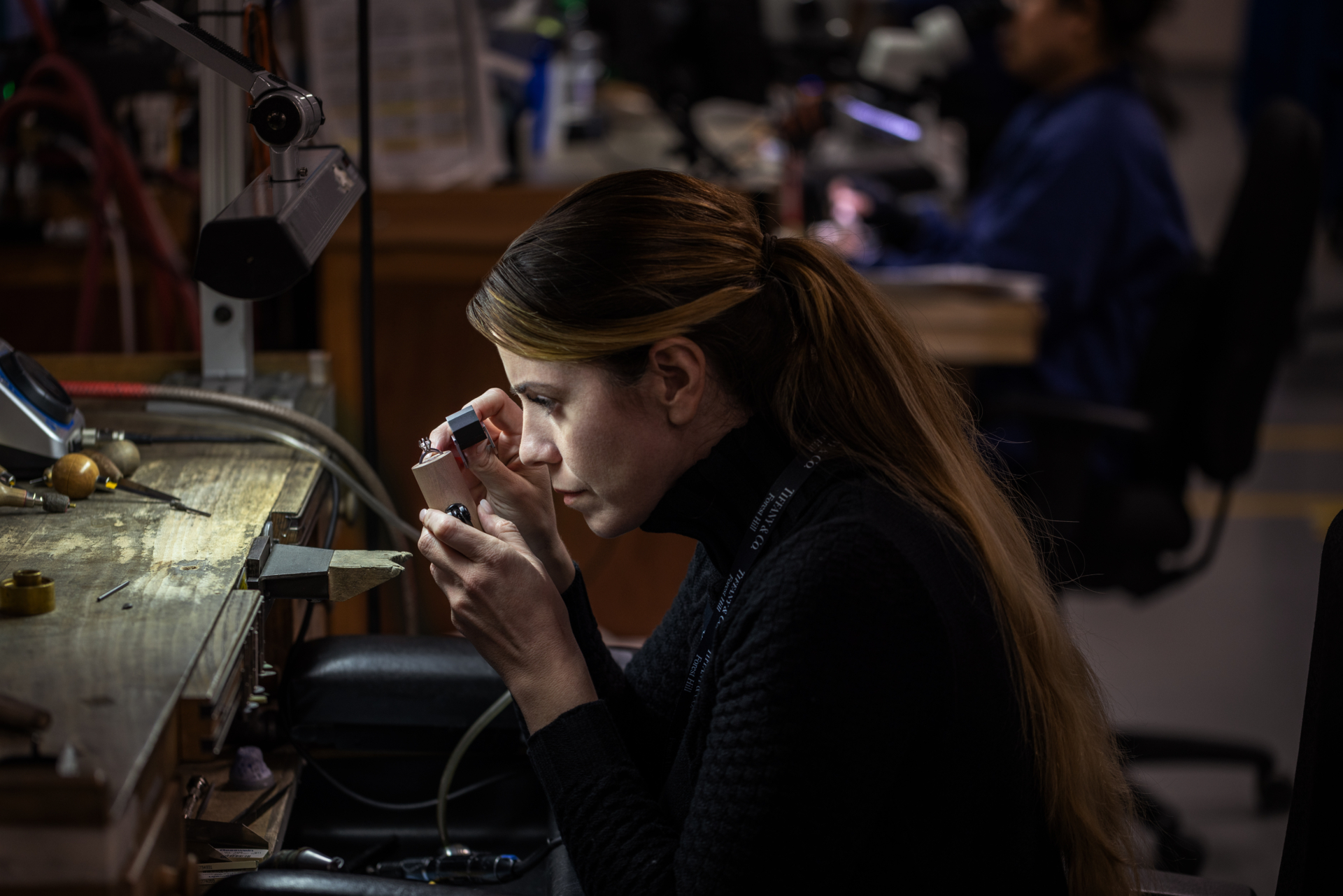 Tiffany Blue® kadran, güneş ışını desenine sahip bir taban üzerine hazırlanır. Daha sonra, zanaatkarlar üç gün boyunca her katmanı kurutup sertleştirerek çok katmanlı bir lake uygular. Bu süreç, mükemmel bir sonuç elde edilmesini sağlar.