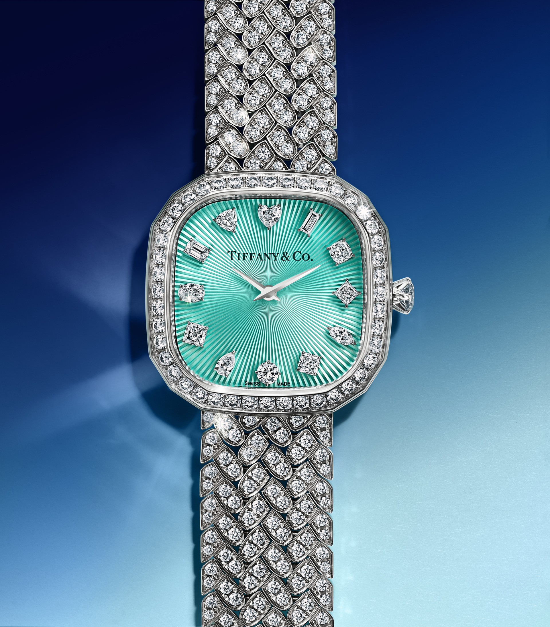 28 mm kasa çapına sahip cushion-shaped Eternity by Tiffany saat, toplamda 1,6 karattan fazla 67 pırlanta ile tasarlanmıştır. Bu pırlantalar arasında 12 saat işareti için kullanılan pırlantalar, pırlanta detaylı taç ve bezel üzerindeki 44 round brilliant pırlanta bulunuyor. Model, 18 ayar rose gold veya white gold kasalarla; siyah lake ya da Tiffany Blue® guilloché kadran seçenekleriyle sunuluyor.