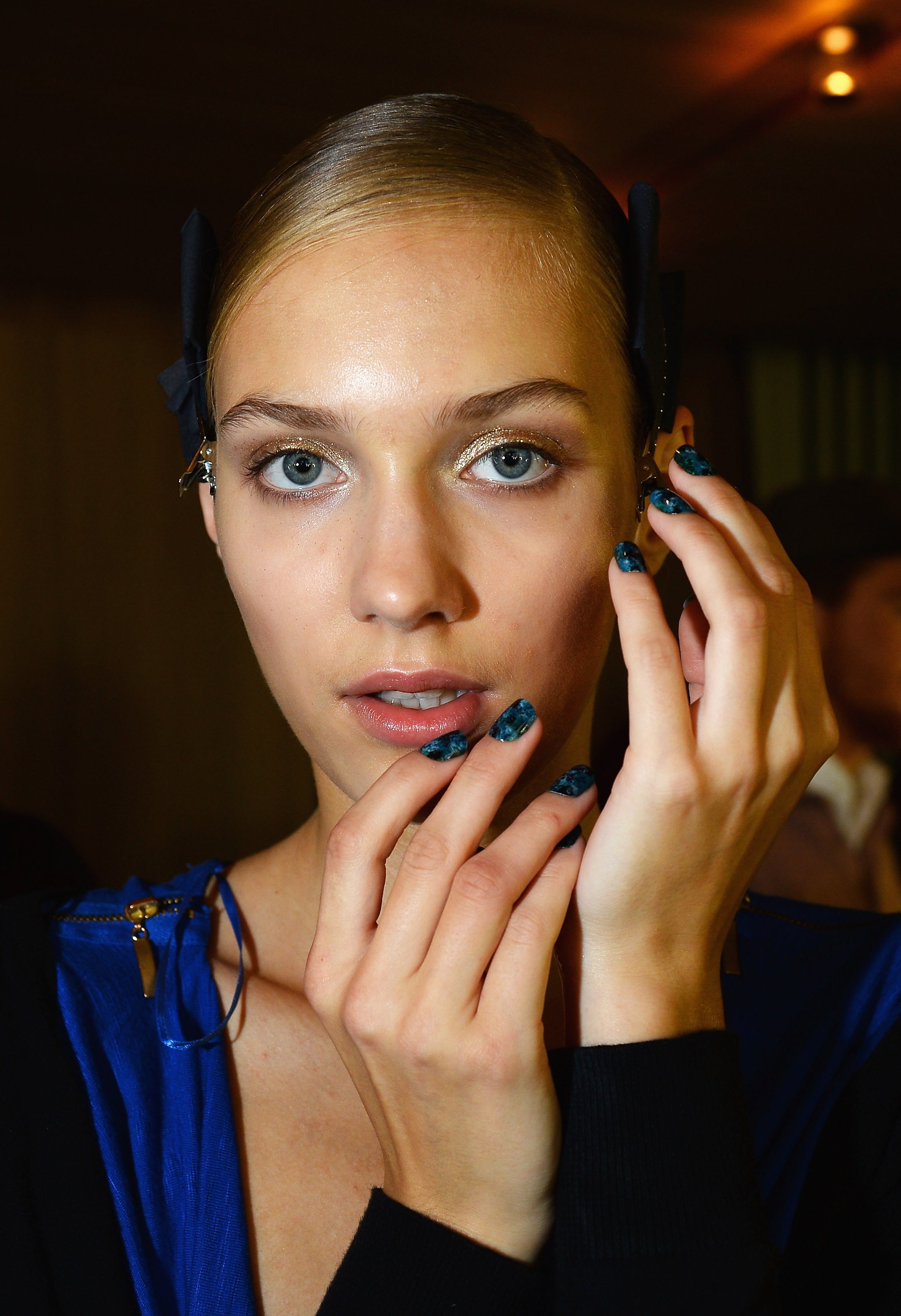 LONDON, ENGLAND – SEPTEMBER 16: A model poses backstage at the Michael van der Ham show during London Fashion Week SS14 at the Hotel Cafe Royal on September 16, 2013 in London, England. (Photo by Ben A. Pruchnie/Getty Images for CND)