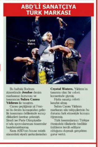 Geçtiğimiz günlerde dünyaca ünlü sanatçı Crystal Waters’ın sahnesinde Jendue ceket giymesi de markanın globaldeki yükselişini açıkça gözler önüne serdi. 90’lar ikonu Waters, Jendue ceketiyle modaseverlerin beğenisini kazanırken, sanatçının markayı kendisinin keşfettiği ve ceketi bu şekilde aldığı da öğrenildi.