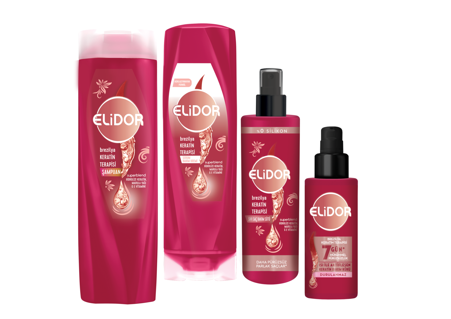 Elidor saç bakım alanında en çok tercih edilen işlemlerden biri olan keratin bakımını, fonksiyonel marka duruşunu güçlendirerek geliştirdiği Brezilya Keratin Terapisi Serisi sayesinde ulaşılabilir kılıyor. Saçları canlandıran Keratin Bakım Şampuanı, ipeksi yumuşaklıkla pürüzsüz gösteren Keratin Terapisi Serum Bakım Kremi, hindistan cevizi yağı ile saçı besleyen ve nemlendiren Keratin Bakım Sütü, ısı ile aktifleşen teknolojisi ile 7 gün boyunca saçın pürüzsüz kalmasını sağlayan Keratin Bakım Kürü, Brezilya Keratin Terapisi Serisi’nde yerini alıyor. Formülündeki Hidrolize Keratin ile Elidor, zahmetsizce pürüzsüz saç görünümüne ulaşmayı kolaylaştırıyor.