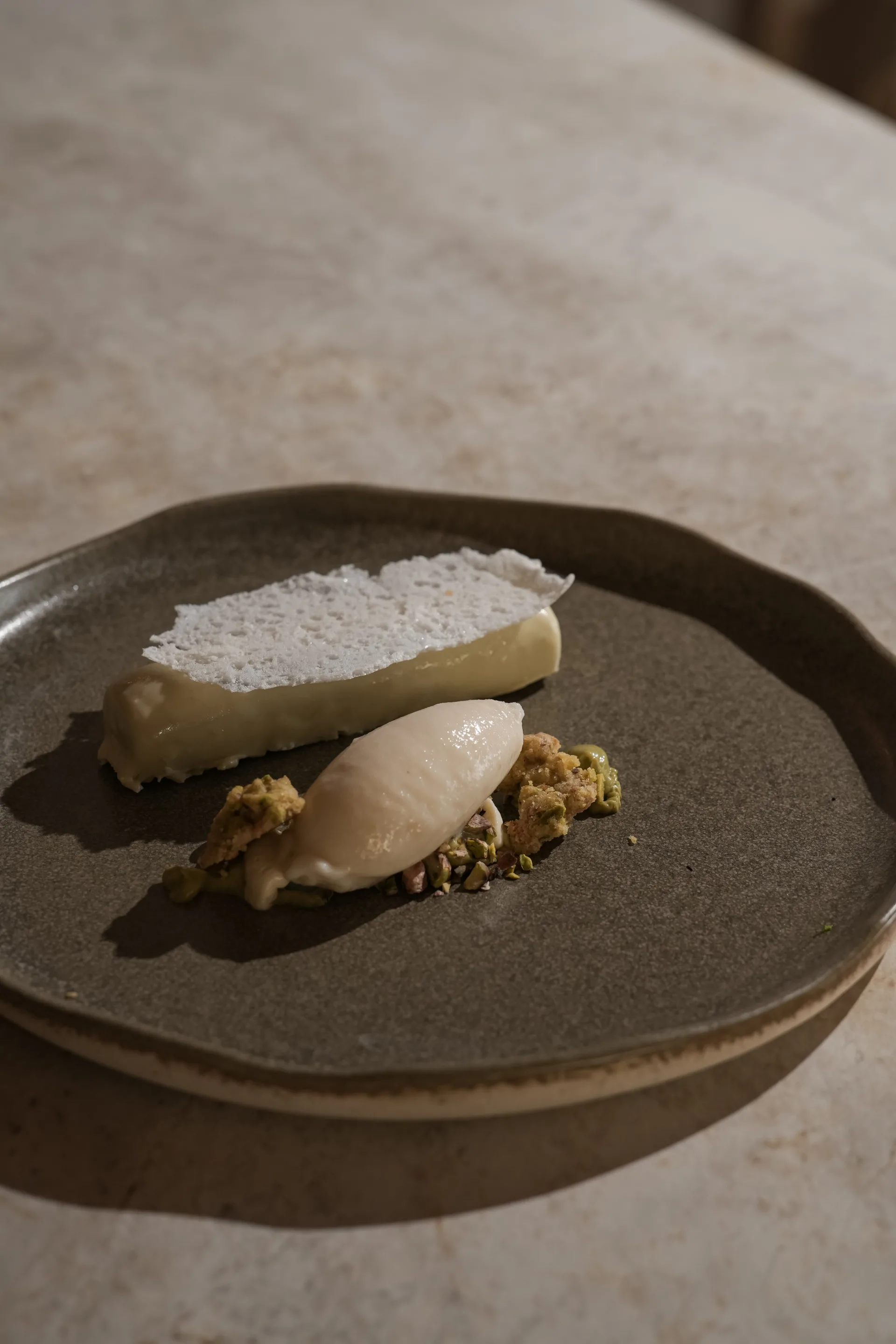 kestane dacquoise ve fıstık prezentasyonu, menüyü dengeli ve rafine bir tatlı kapanışla