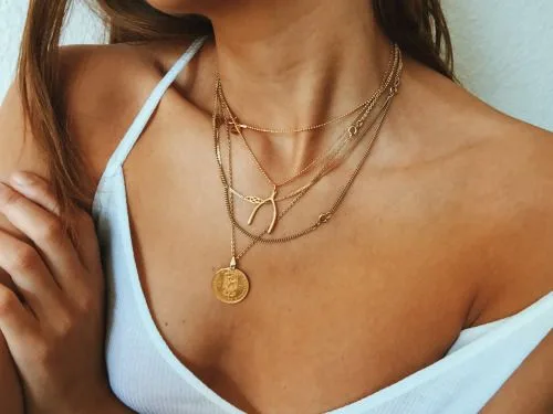 Yazın altın rengi zincirleri üst üste kullanıyorsanız, özellikle bronz tende beyaz kombinlerle kullanmanız görünümünüzü daha çekici hale getirecektir.