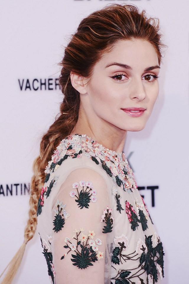 Olivia Palermo, floral elbisesinin romantik etkisini, karmaşık örgüsüyle destekliyor.