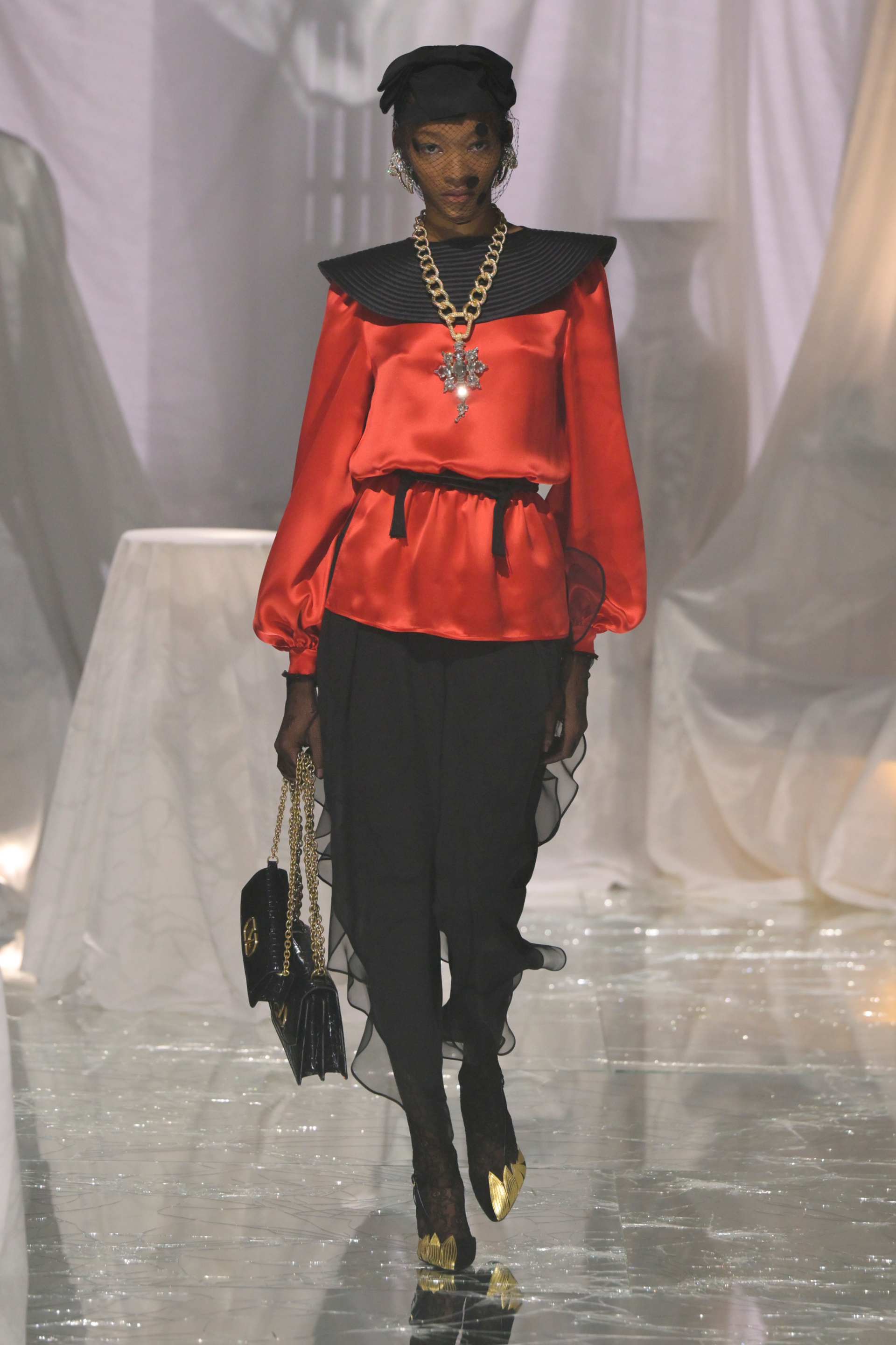 Michele’nin Gucci’deki Midas dokunuşunu kanıtladığı aksesuarlar özellikle etkileyiciydi; ister kurdele ile bağlanan yüksek topuklular, ister vintage, hanımefendi stillerine gönderme yapan çantalar olsun, hepsi oldukça dikkat çekiciydi.