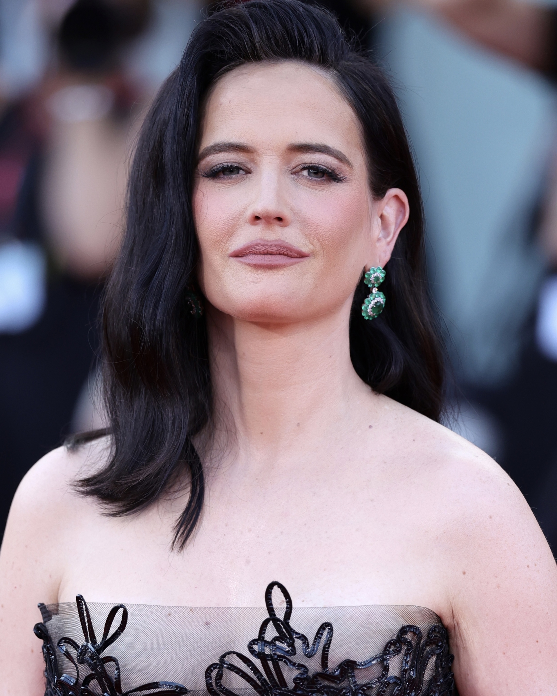 Eva Green ise ismiyle koordine, Chopard imzalı, parlak zümrüt küpe tercihiyle kırmızı halıda yürüdü.