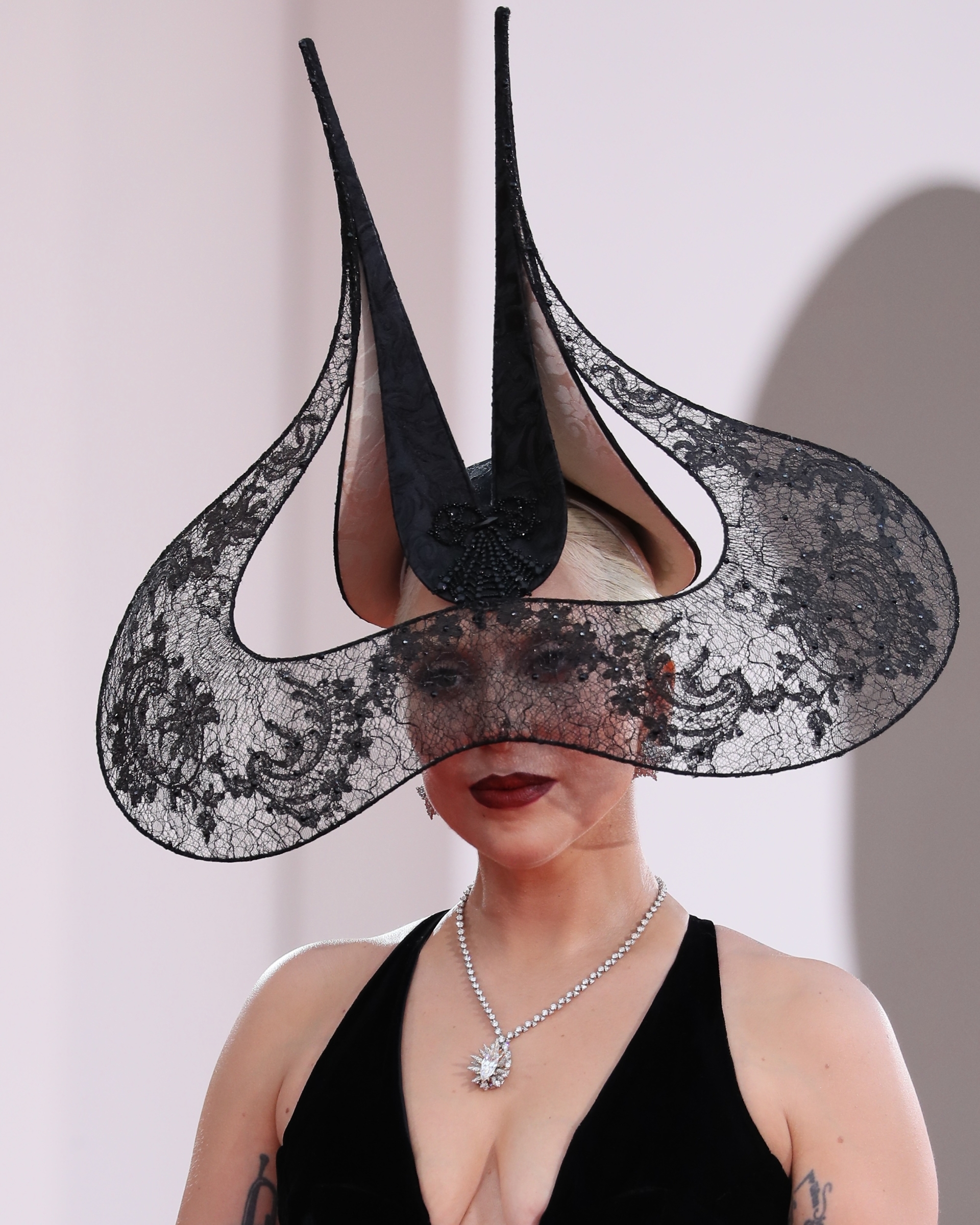 Lady Gaga Joker filminin kırmızı halısına Tiffany & Co. imzalı, platin ve sarı altından yapılmış, elmaslarla süslü kolye ve Philip Treacy 2001 couture koleksiyonundan bir maske ile katıldı.