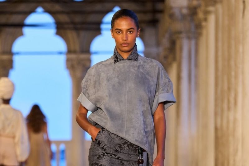 Sanat ile mimariyi kusursuzca harmanlayan ve tarihte Doğu-Batı ticareti açısından önemli rol oynayan İpek Yolu’nun kesiştiği Venedik, Max Mara 2025 Resort defilesine ev sahipliği yaptı. Geçmişte Venedik dukalarının resmi ikameti olarak kullanılan ve Gotik mimarinin başyapıtlarından biri olarak kabul edilen Palazzo Ducale’nin büyüleyici atmosferinde gerçekleşen defilede, takım elbiseler, gösterişli mantolar, kaftanlar, tunikler ve ünlü tasarımcı Stephen Jones ile hazırlanan oryantalist saç aksesuarları başroldeydi.