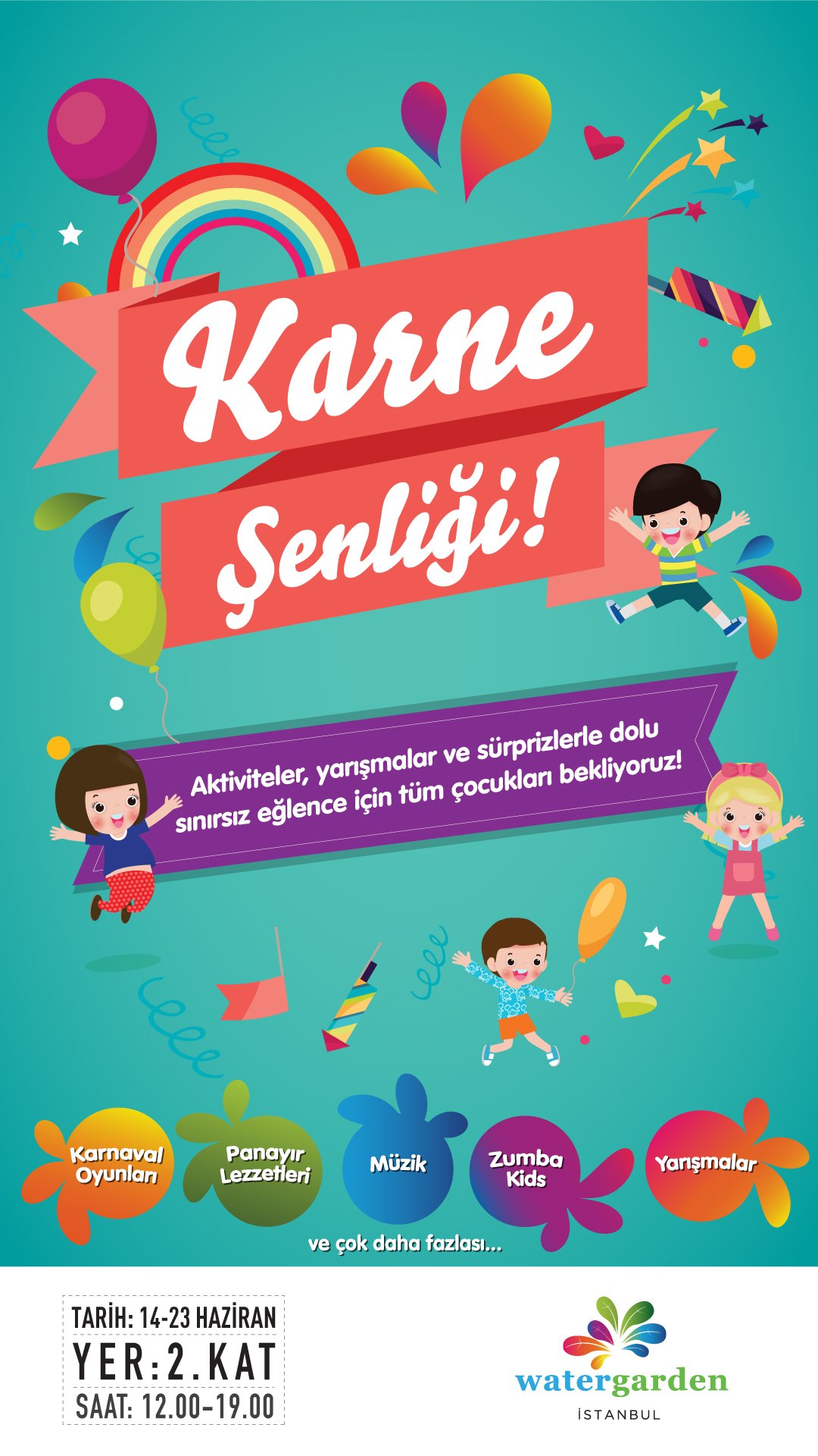 Watergarden İstanbul’da düzenlenecek Karne Şenliği’nde çocukları gün boyu katılabilecekleri karnaval oyunları, zumba kids ve ödüllü yarışmalar bekliyor.