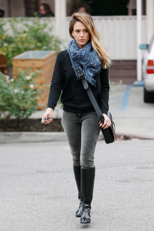 crew-neck-sweater-skinny-jeans-rain-boots-crossbody-bag-scarf-original-1477 Minimal görünümünüzü şallarla kırın.