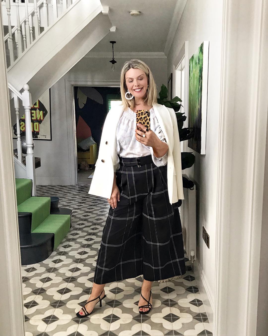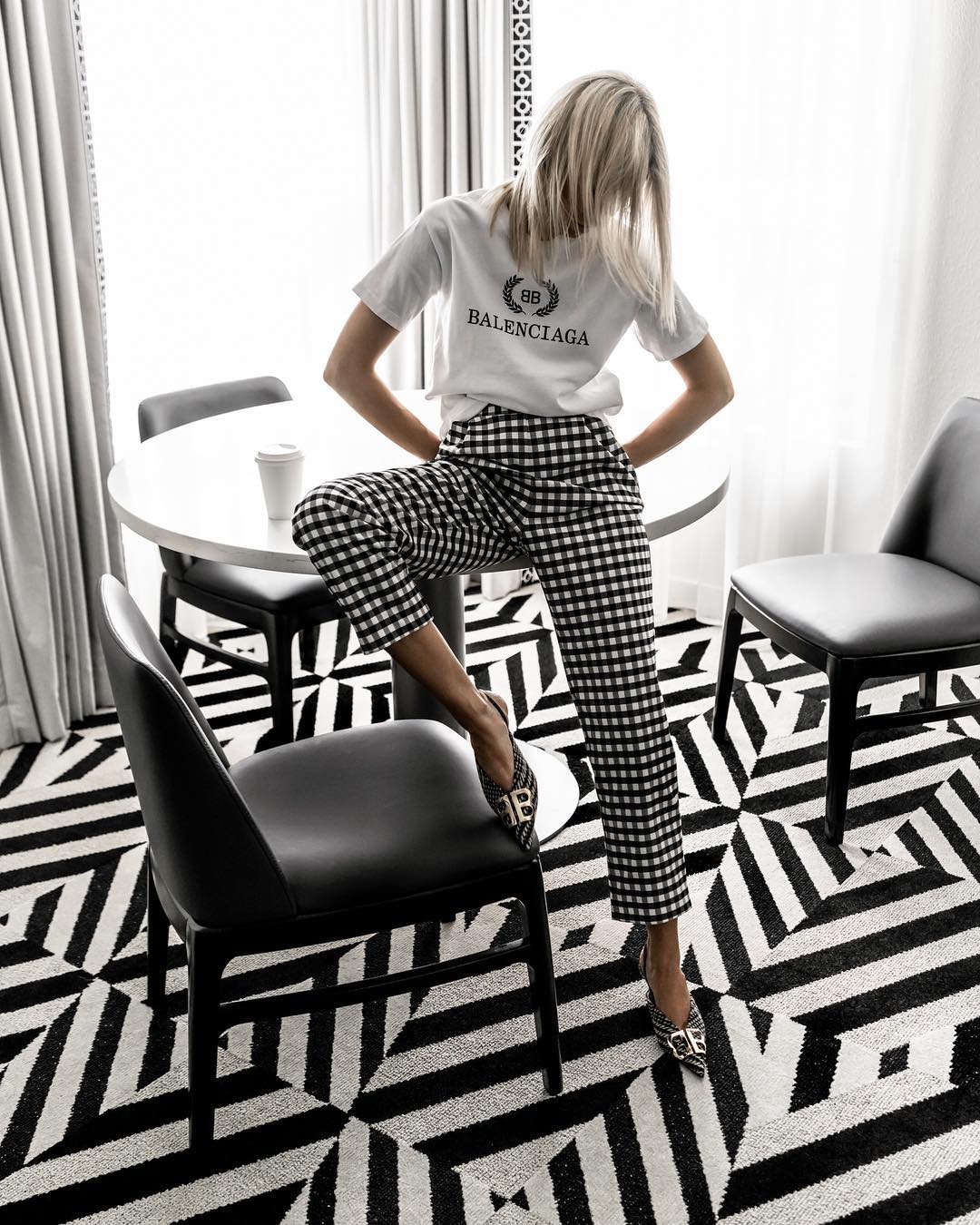 Siyah-beyaz pötikare desen zamansızdır. Bu nostaljik deseni ipek bir bluz ile romantik kılabilir veya tıpkı bu örnekteki gibi logolu bir tişört ile modernize edebilirsiniz.