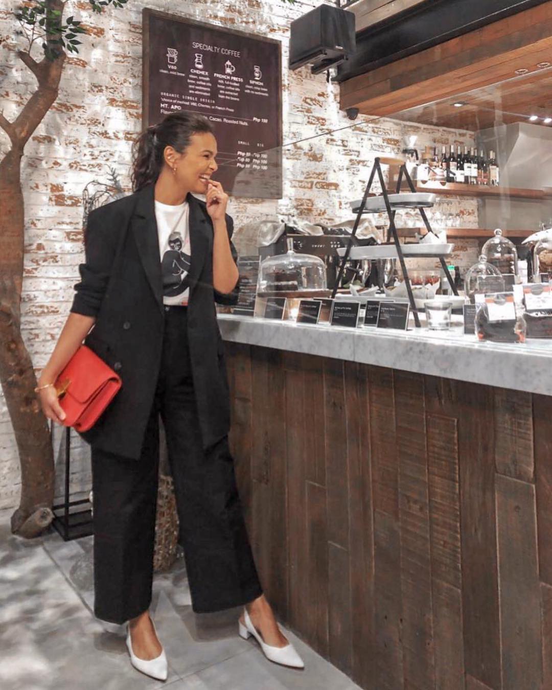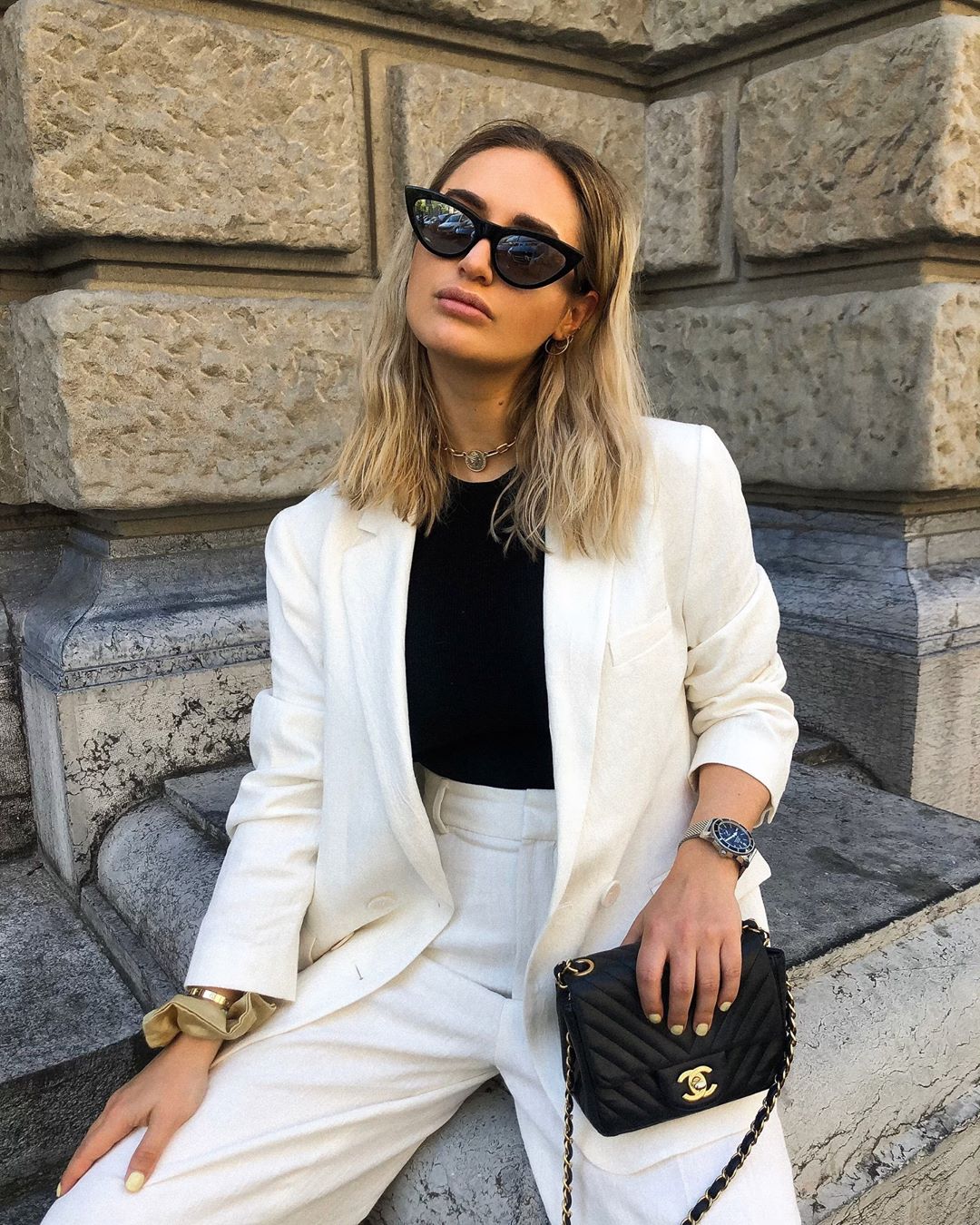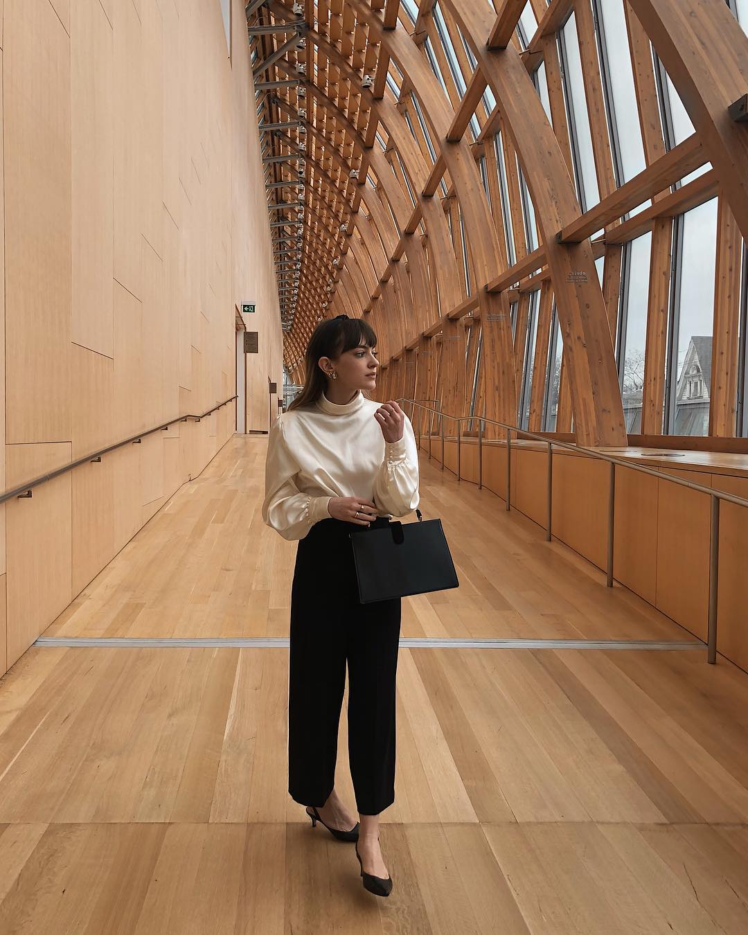 Sofistike bir görünüm için ihtiyacınız olan üçlü: Siyah kumaş pantolon, beyaz ipek bluz ve kitten heel ayakkabılar.