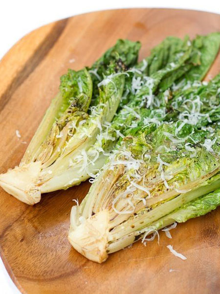 Daha sonra marulların közlenmiş taraflarını temizleyip, üzerinde zeytinyağı gezdirin ve 1 çorba kaşığı rendelenmiş parmesan peyniri ekleyin.