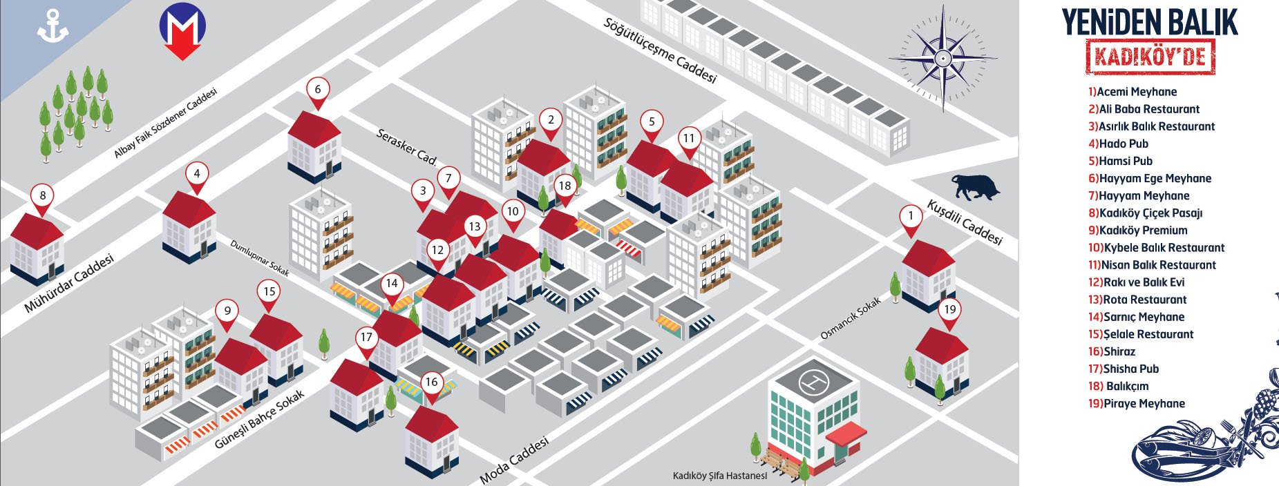 Yeniden Balık Sezonu Noktaları: Kadıköy’de Balıkçım, Hayyam Meyhane, Hayyam Ege Meyhane, Hamsi Pub, Rota Restaurant, Asırlık Balık Restaurant, Şelale Restaurant, Shisha Pub, Kadıköy Premium, Kadıköy Çiçek Pasajı Restaurant, Rakı ve Balık Evi, Sarnıç Meyhane, Acemi Meyhane, Hado Pub, Ali Baba Balık Restaurant, Nisan Balık Restaurant, Kybele Balık Restaurant, Shiraz ve Piraye Meyhane. Beşiktaş’ta Beşiktaş Balıkçısı Turgut Vidinli, Olta Balık, Kartal Restaurant, Hasbi’nin Yeri, Babalık, Meraklı Balık Restaurant, Çarşı Balık, Ahtapot Balık, Keyfi Keyf, Mey Meze, Kırık Kadeh, Duayen Meyhane, Hayat Memat ve Sokak Restaurant Cengiz’in Yeri.