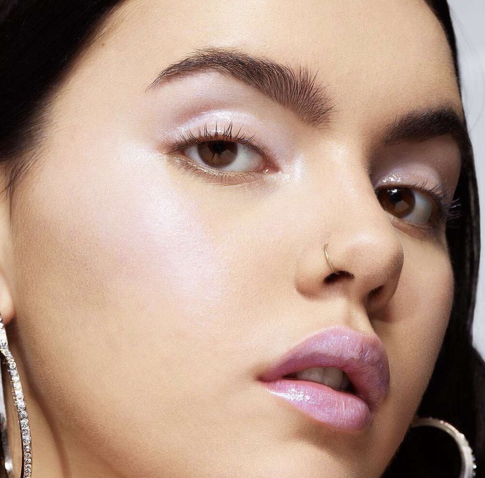 Öncelikle ihtiyacın olanlar listesinde: mavi mor alt tonlu holografik farlar, rimel ve göz alıcı bir highlighter olmalı. Amacımız yüzümüzde parlak ama soğuk bir görünüm yaratmak. Holo glam bize iddialı ama aynı zamanda hafif bir makyaj görünümü sunuyor, dolayısıyla hem gece hem günlük makyaja uyarlamak mümkün.