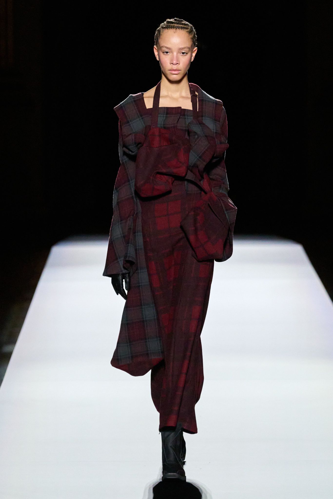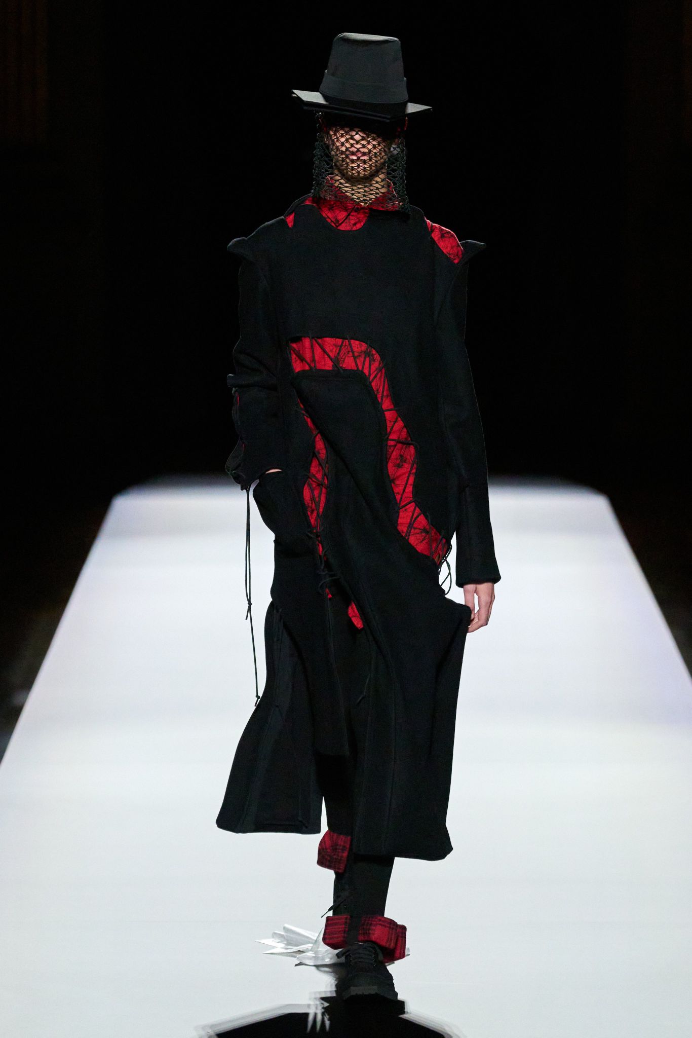 Tezatlığa ek olarak, pötikare ve ekose desenleri de Yohji Yamamoto defilesine hareket ve çeşitlilik katıyor. Vatkalı modeller ve farklı kesimlerle buluşan bu kumaşlar, adeta bir başkaldırı izlenimi veriyor. Dahası, kırmızı ve siyahın uyumunun öne çıkarıldığı görünüm sayesinde gösteride heyecan yükseliyor. Aksesuarların mutlak gücü defileyi desteklerken, düğmelerdeki yenilikçi kullanım da göz alıyor.