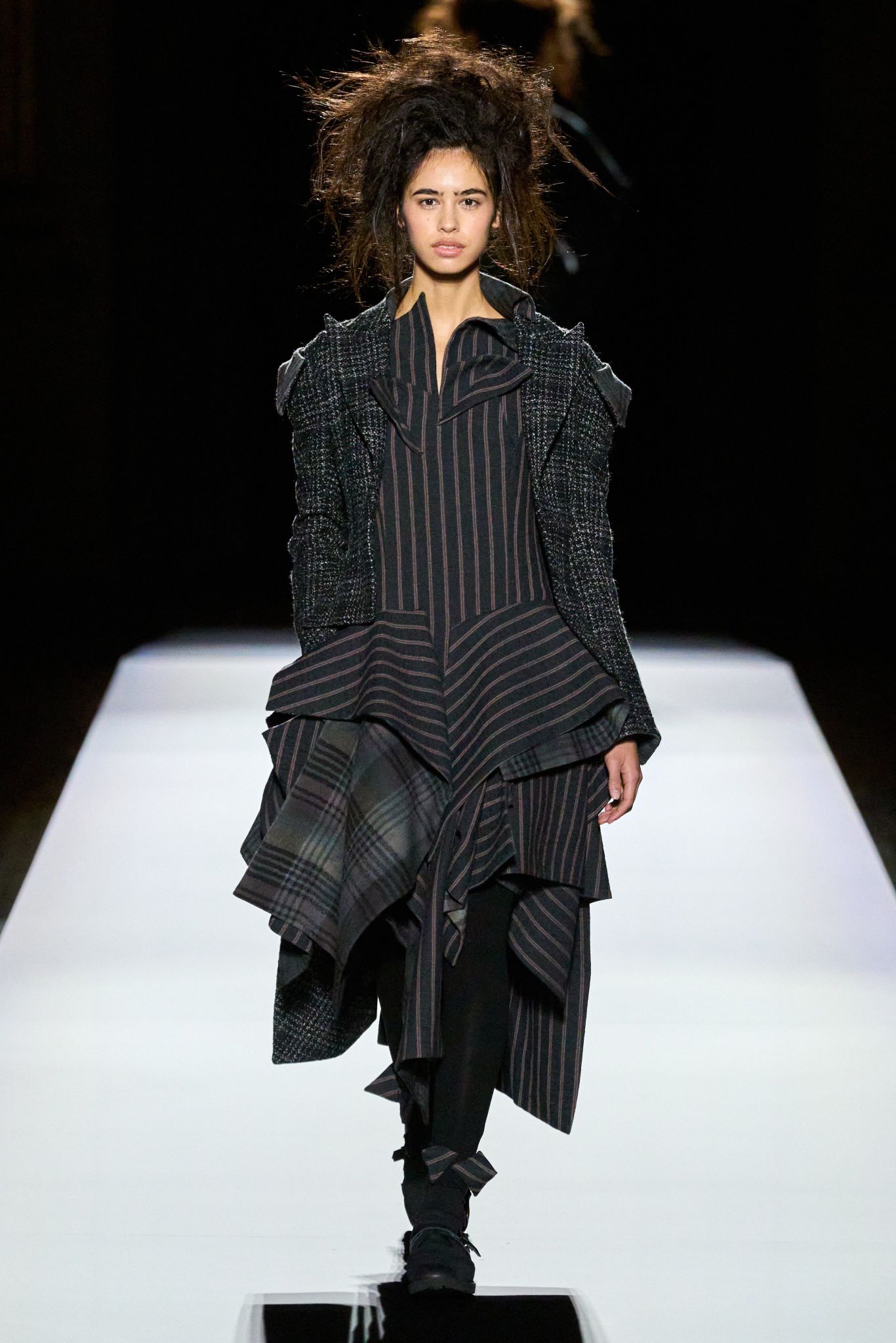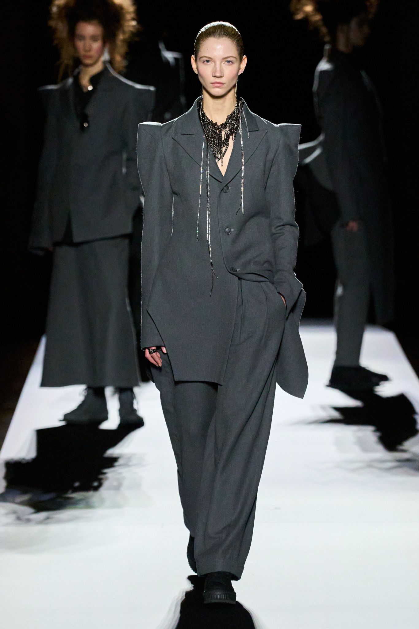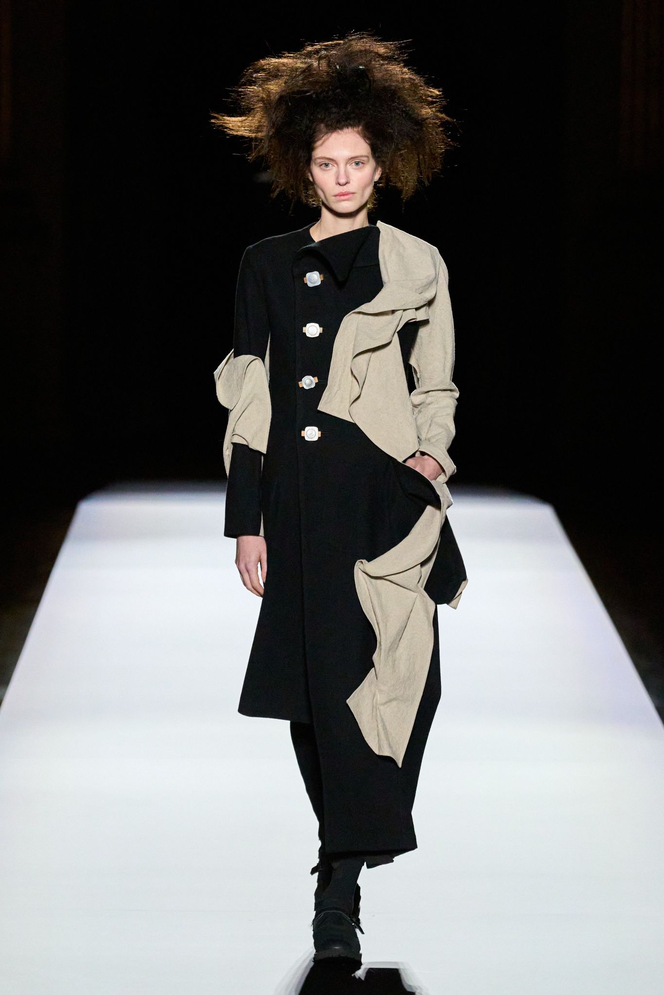 Minimalist renk paletiyle dikkat çeken marka, özellikle siyah tonlardaki geniş ve akıcı kumaşları tasarımcının imzası haline gelmiş öğelerle buluşturarak yeni bir perspektif yaratıyor. Podyumdaki renk oyununa eşlik edecek şekilde yarısı siyah yarısı beyaz unsurlarla Yamamoto’nun sanatsal vizyonunu tetikleyen defile, derin ve karanlık olarak betimleyebileceğimiz şiirsel bir ortam hazırlıyor.