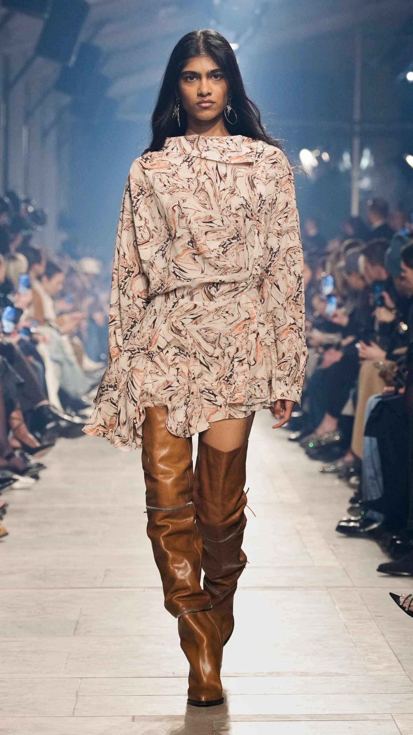 Soyut sanatın hayranı olmasanız bile, istek listenize soyut baskılar eklemek kesinlikle buna değer. Hayranı olduğunuz renk tonları ve ‘mat’ doku kombinasyonlarıyla soyut desenleri birleştirerek şık bir kombin yaratabilirsiniz. Bu sizin için yeterli değilse, soyut sanat ilhamlı parçaları, yarı saydam şifon kumaşlarla bohem bir görünüm yaratmak için de kullanabileceğinizi bilmelisiniz. Yeni sezondan özellikle Isabel Marant’ın podyum görünümünü ilham panonuza koyabilirsiniz: ölçülü renklerde figüratif olmayan soyut desen, hafif kumaş, mini uzunluk ve diz üstü ‘balıkçı’ çizmeleri.