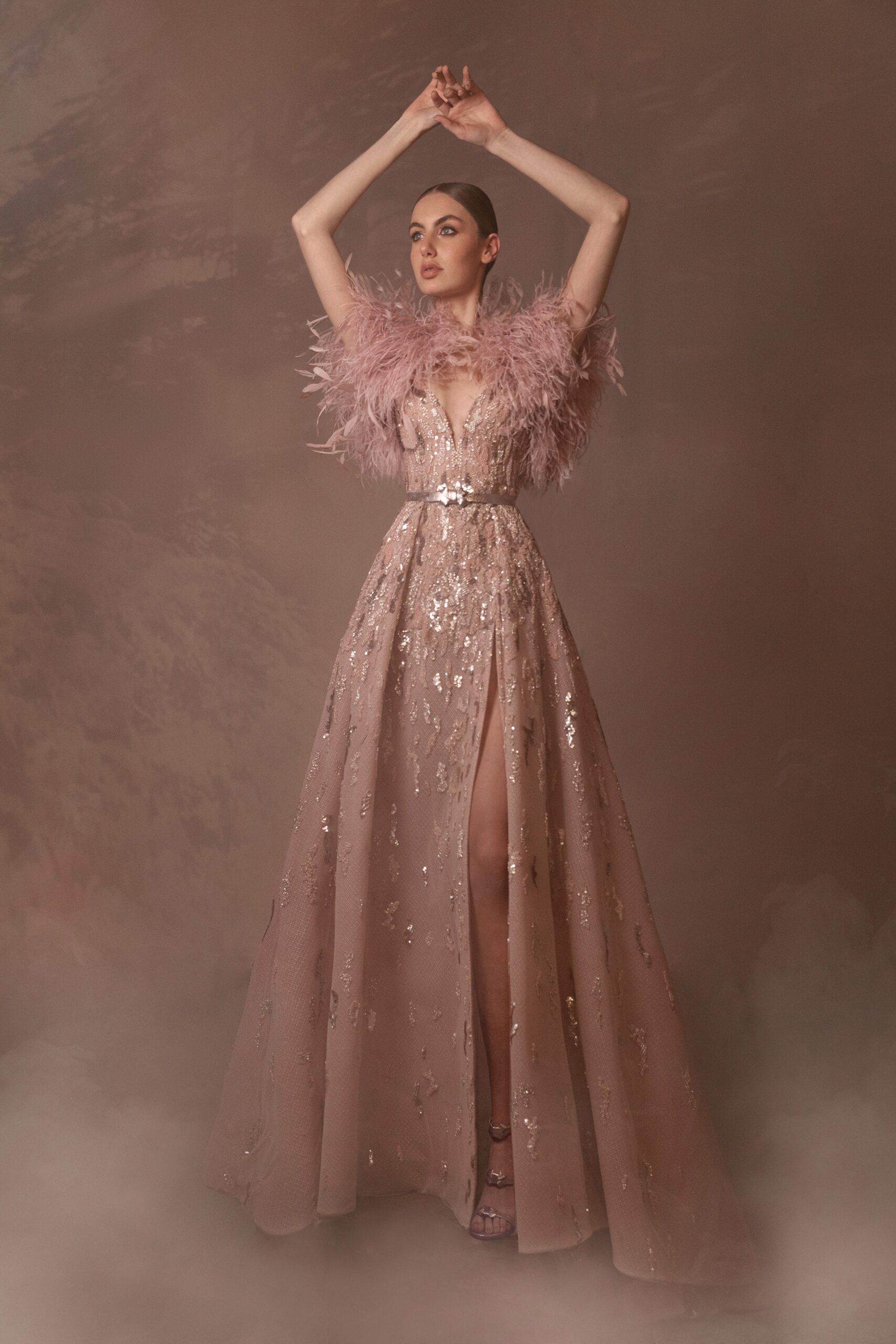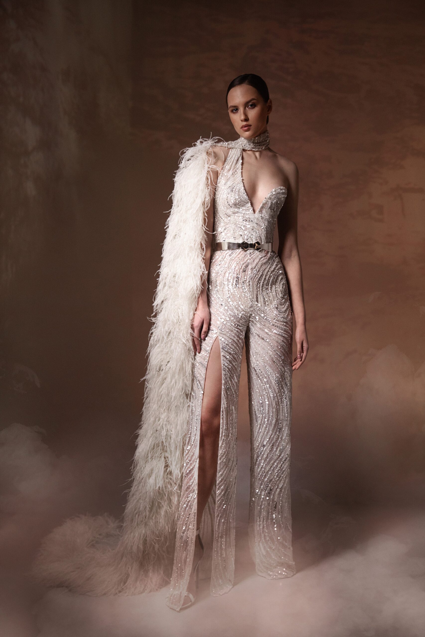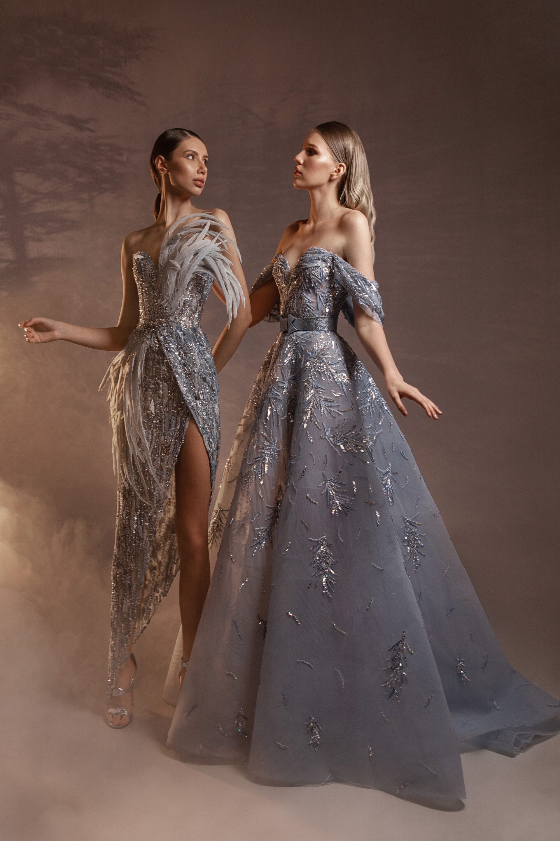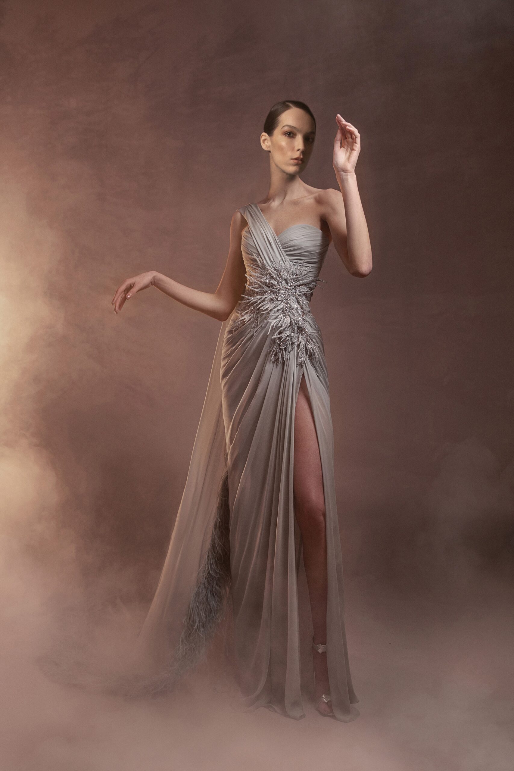 Murad’ın imzası haline gelen işlemeler ve tüylerin yanında tasarımcı bu kez Lurex’i de bazı tasarımlara dahil ediyor. Gümüş kaplama ve esnek 3D süslemeler ise, yaz aylarında ay ışığının dağlara yansımasını taklit etmek için öne çıkıyor.